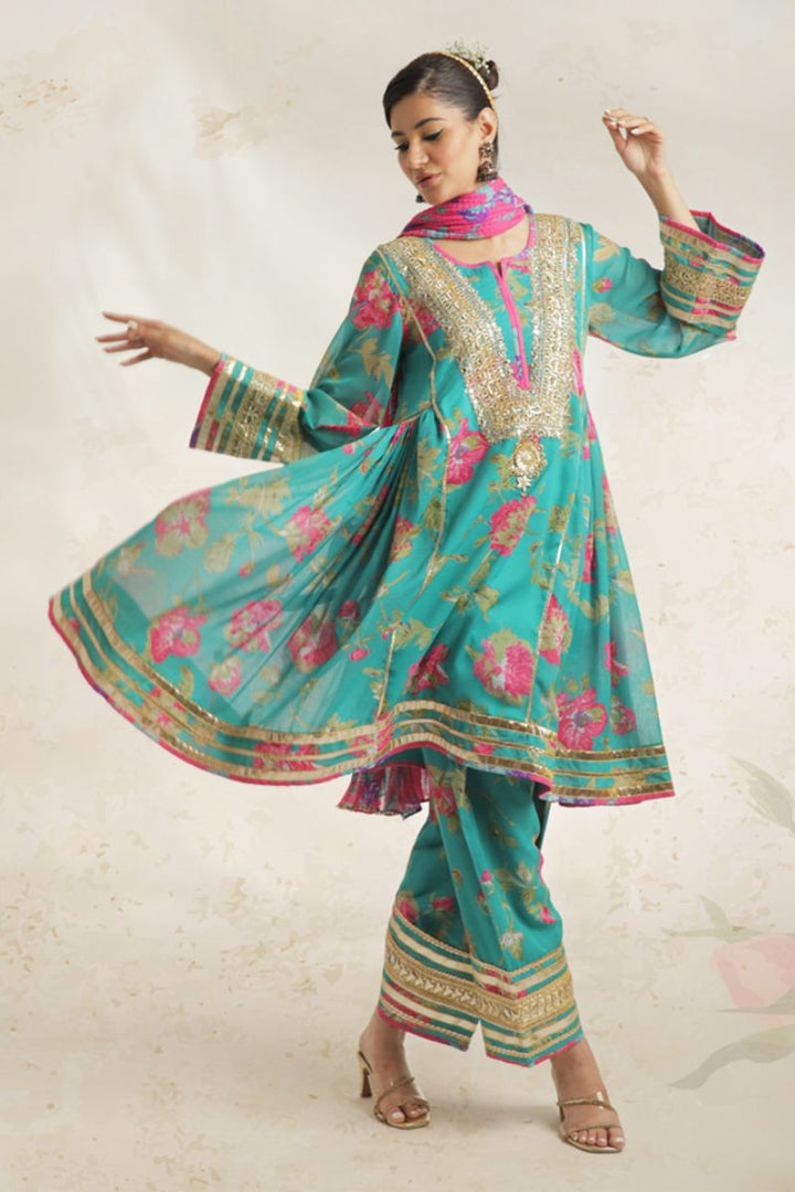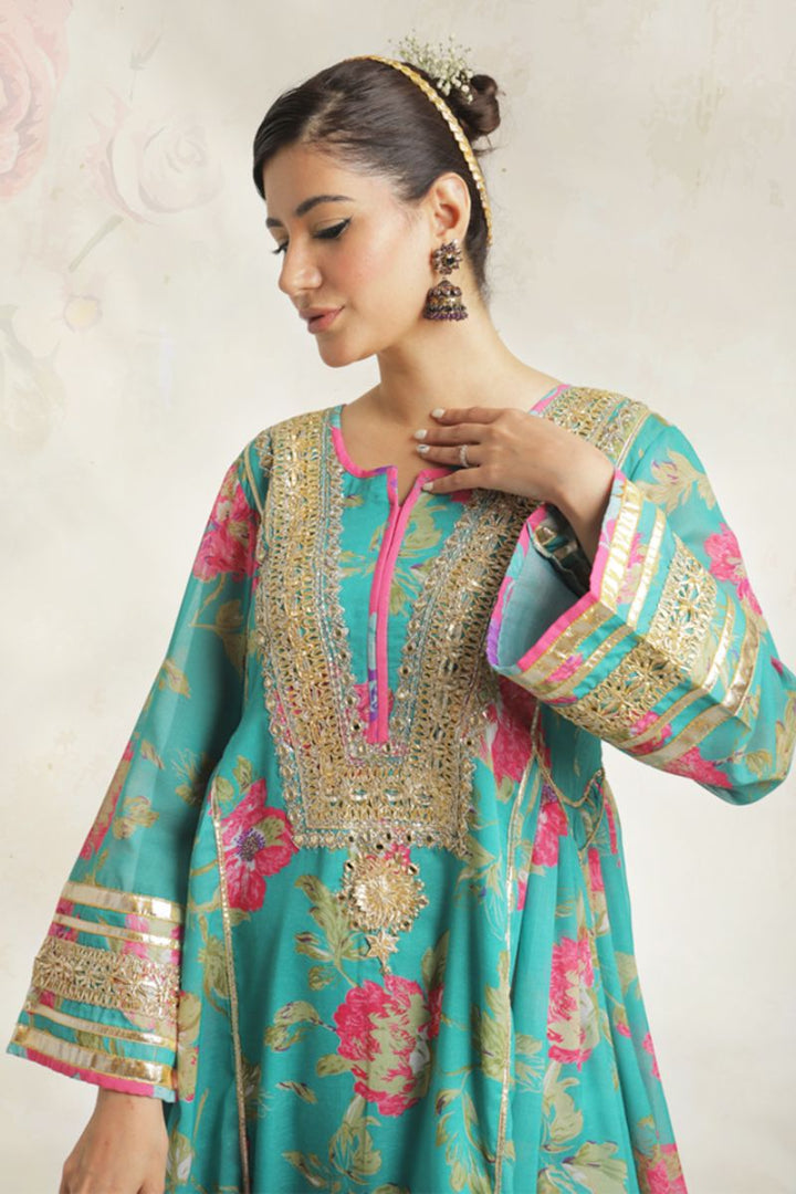 Gulenoor - Bhopali - Teal - Acrylic Lawn - 3 Piece