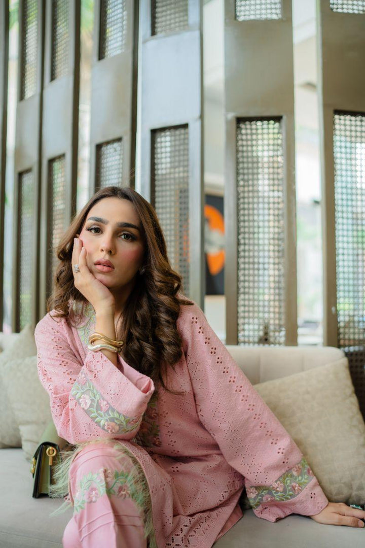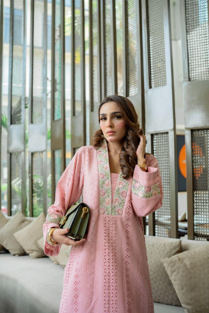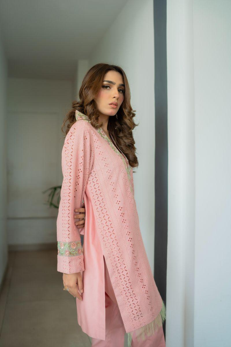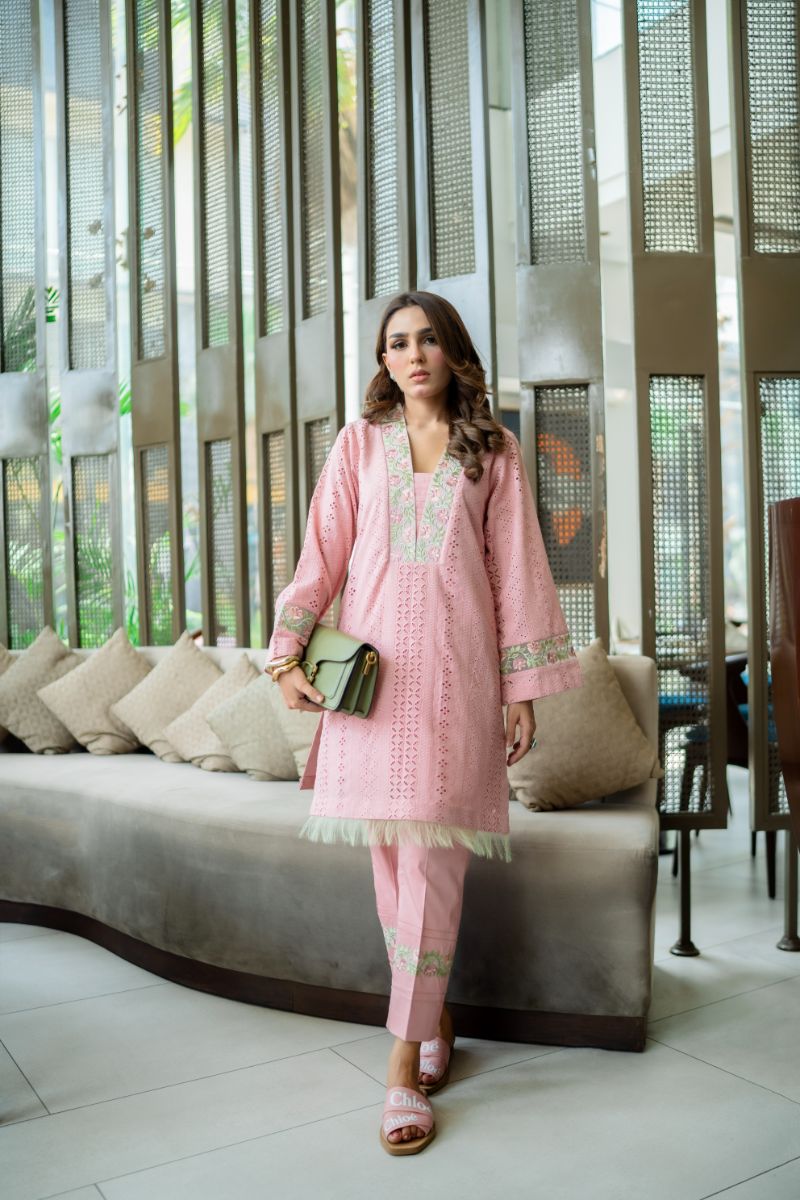 Dress to impress in our stunning pink 2-piece set. Crafted from delicate chikankari fabric, it features exquisite pink and green floral patchwork on the neckline, sleeves, and shalwar. The fringe lace hemline adds a chic finish. Perfect for any occasion, this ensemble combines effortless style and sophistication, making it a must-have for your summer wardrobe.