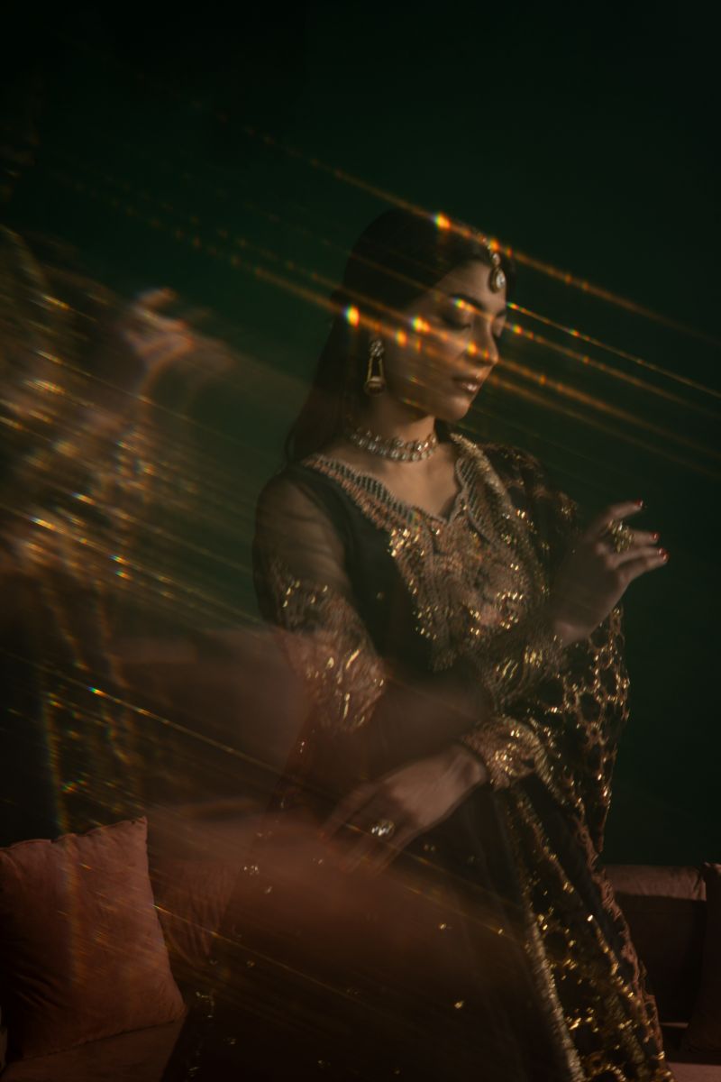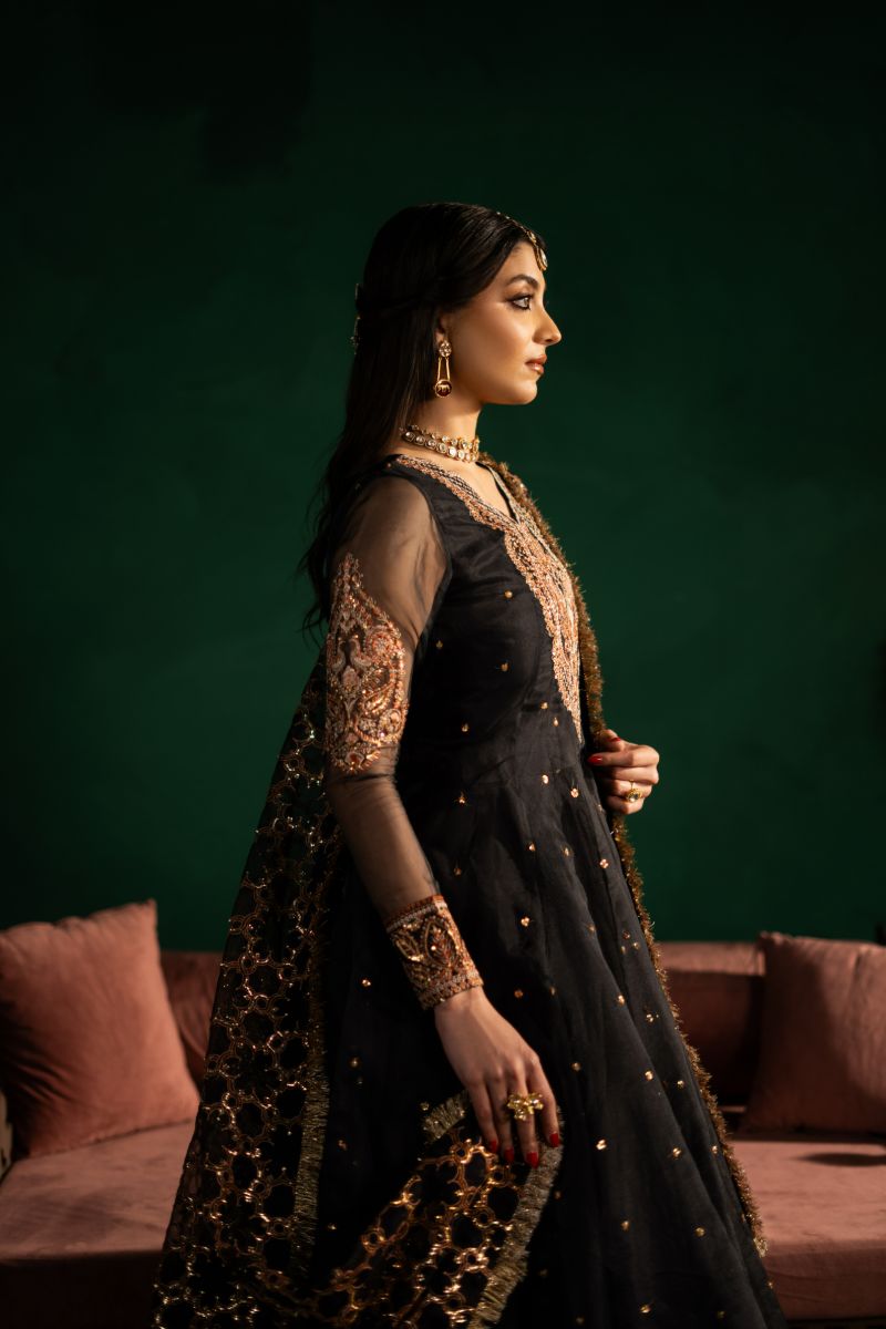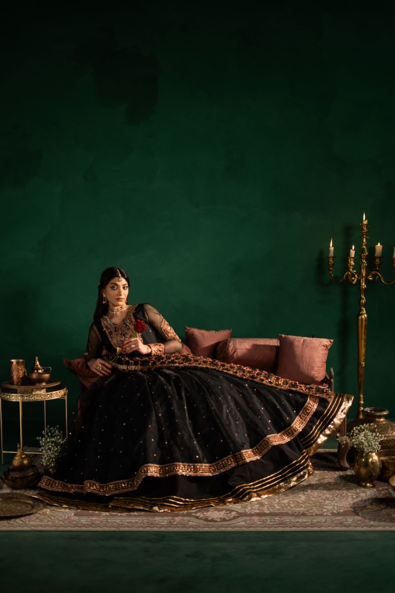 Elegant Black Embroidered Outfit This stunning black lehenga set features heavy embroidery on the neckline and sleeves, decorated with sequins for a touch of sparkle. The dress also has a delicate sequin spray, adding glamour The look is completed with a heavily embroidered dupatta, finished with a kiran border for a traditional touch. The lehenga is designed with a three-layered lappa border, giving it a rich and elegant finish. Perfect for weddings, festive occasions, and special celebrations.