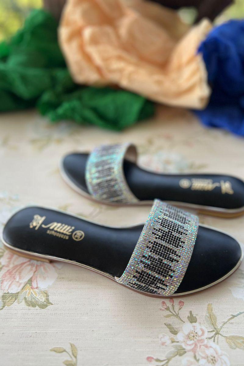 Elevate your style with these Semi Formal Slides. The heavily embellished 2 tone Diamentes upper features a dazzling design in rainbow silver and golden stones, adding a touch of glamour to any outfit. Plus, the foam cushioned insole provides all-day comfort. Perfect for any occasion!