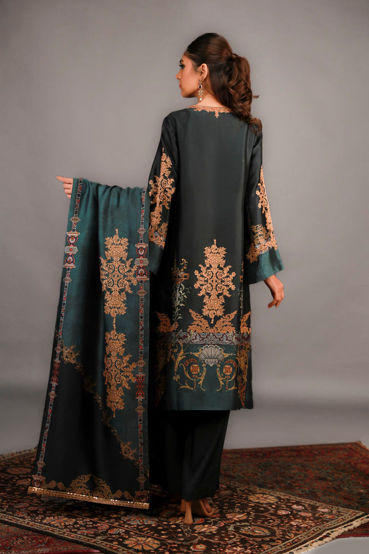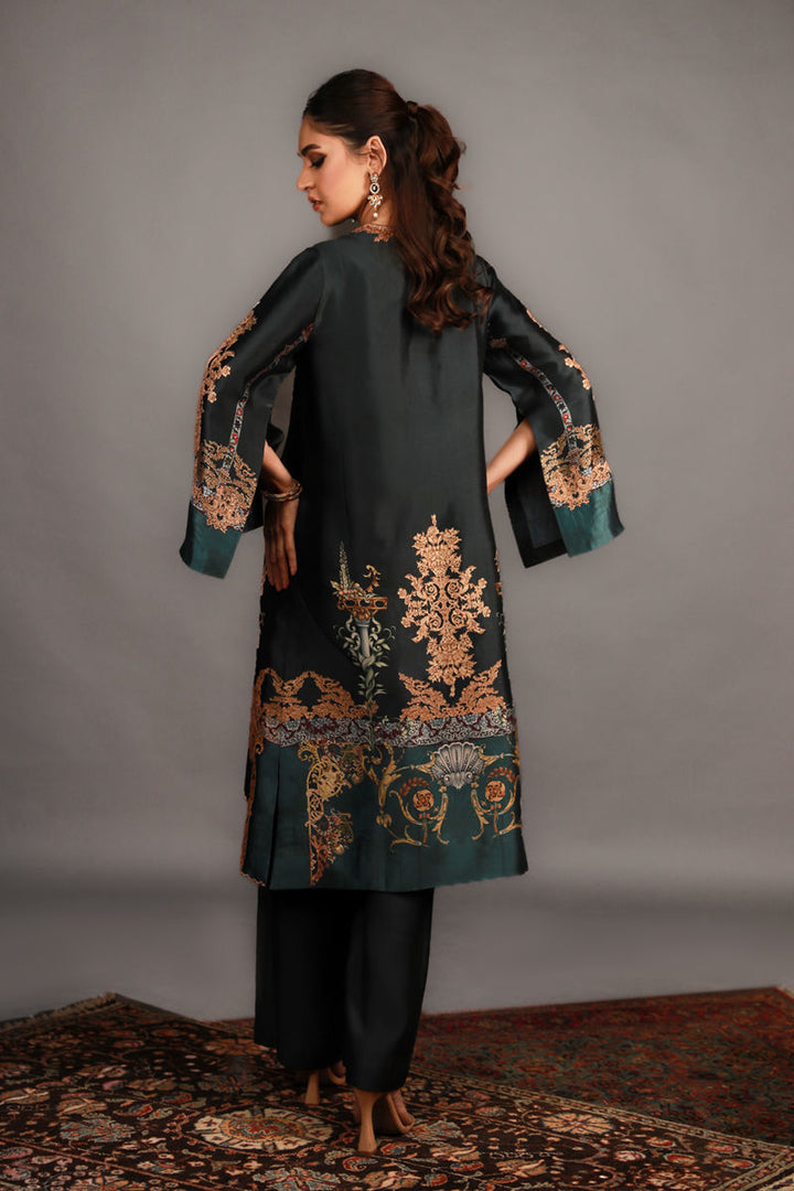 This striking three-piece set in dark rich teal colour features outlined prints in antique metallic thread, showcasing Shamaeel’s signature craftsmanship. The meticulous hand embellishments add a unique touch of sophistication, setting this piece apart. Complemented by a two-tone long printed stole that enhances the shirt's layout, the trendy sleeve cut maintains an urban vibe. This ensemble is an ideal choice for evening occasions, effortlessly blending classic elegance with contemporary style.