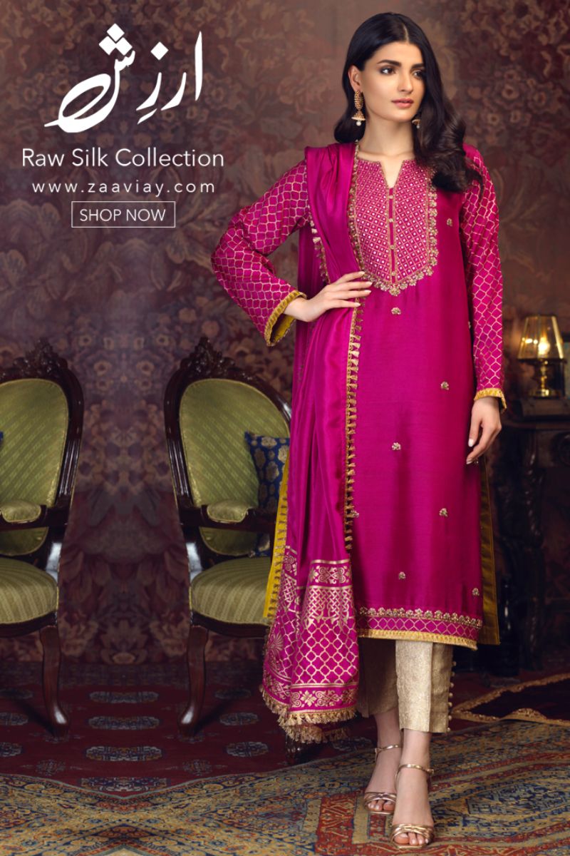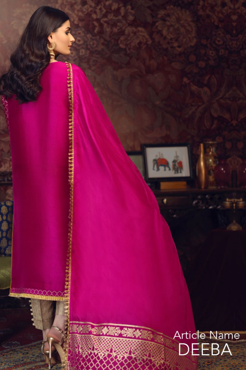 'Deeba' a definite ready to wear for the festive wardrobe. A straight line magenta shirt, alluring in pk raw silk fabric with geometrical hand crafted neckline, incorporated with kora, dabka, aari, zaari. Sleeves are screen printed with accent lime green finishing on sleeves and shirt hem. It is paired with a pure silk dupatta with screen printed borders and edging lace to give it a elegant look.