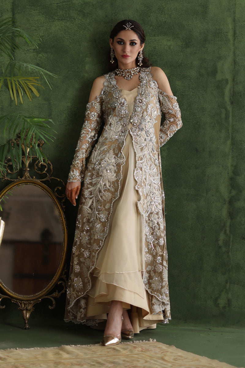 Front open style in overall embroidered canvas captures the essence of an epoque style, blending vintage charm with contemporary flair. The dress has Vintage coffee colour with hint of ivory work, front scallop detailing embellished with pearls, stones, silver resham. Sleeves elegantly reveal the shoulders, embracing a modern aesthetic to the overal look. Comes with inner.