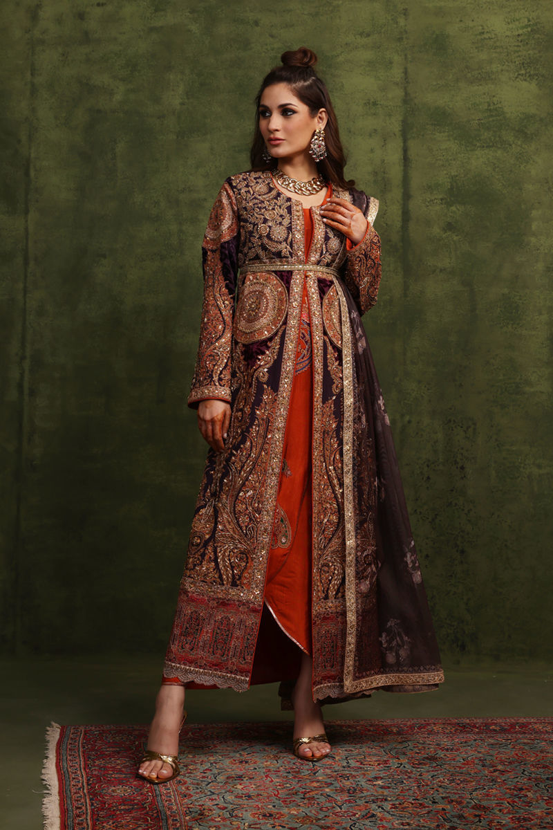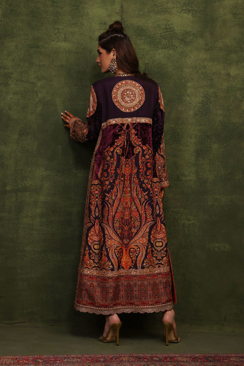 This jacket has a front-open style print is inspired by mughal era textiles, Silk fabric is used in this jacket, The upper body part is created by antique tila thread embroidery which is enhanced with intricate zardozi work. The print is enhanced by beautiful handcrafted zardozi work, Dark rich purple colour palachi fabric is incorporated in the jacket
