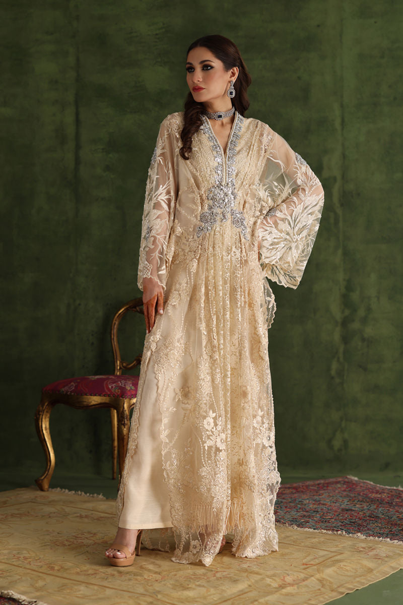 This Kaftan is made from net and organza fabric a sheer and lightweight material. Net and organza fabric has an openwork design that creates a delicate and see-through effect, adding a touch of sophistication to the garment. The Kaftan comes in a beautiful ivory shade, providing a classic and timeless look.