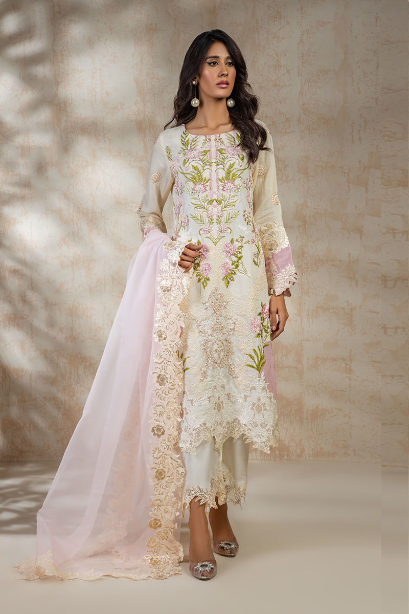 Straight shirt A fully embroidered shirt with beautiful shades of green, pink and ivory resham thread Embroidery is enhanced with pearls Delicate scallop work in the sleeves and daman Paired with beautiful pink organza dupatta with embroidery on four corners. Can be paired with scalloped ivory straight pants.