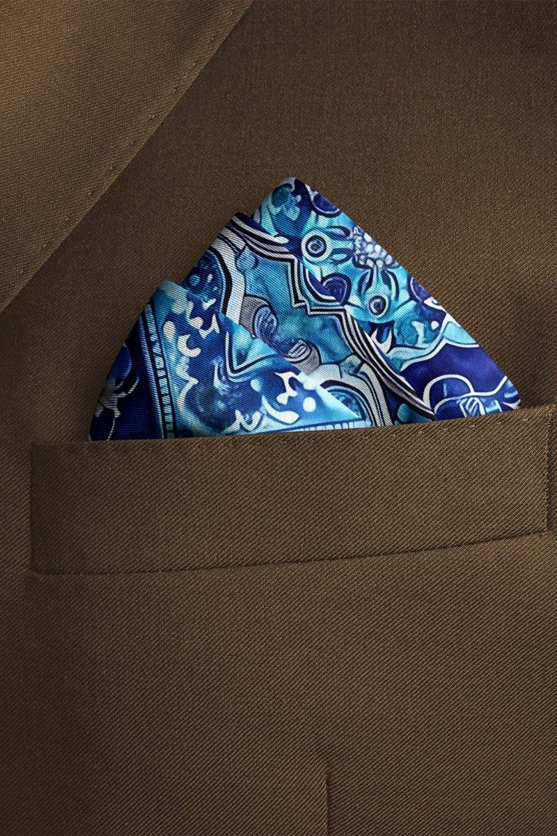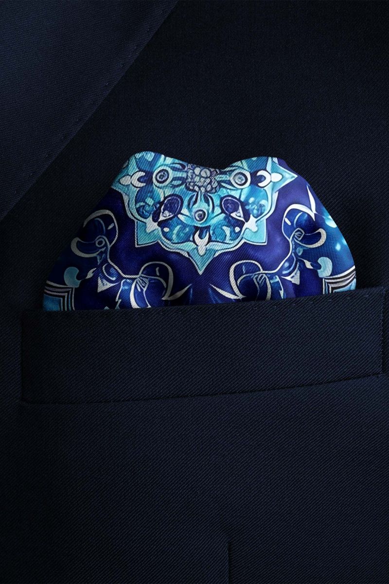 Elegant pocket square in rich blues and gold, featuring mandala-like geometric and floral motifs, exudes refined elegance and versatility, perfect for any occasion.