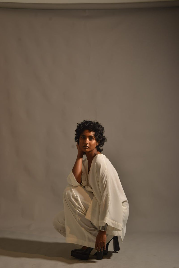 Stand out in our alluring White Mirage Set. A loose cut button down top adorned with shell button and a graceful curved v shaped neckline. Paired with matching flowy trousers with pockets for an ultimate chic comfortable look.
