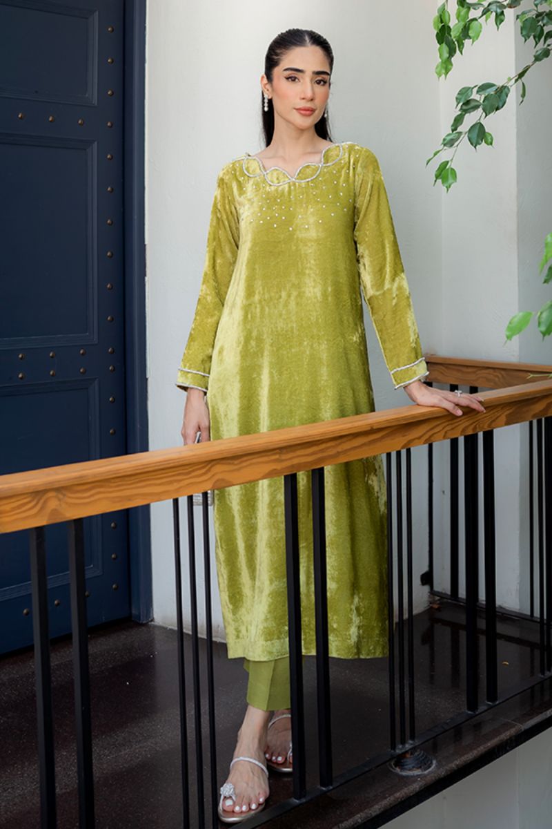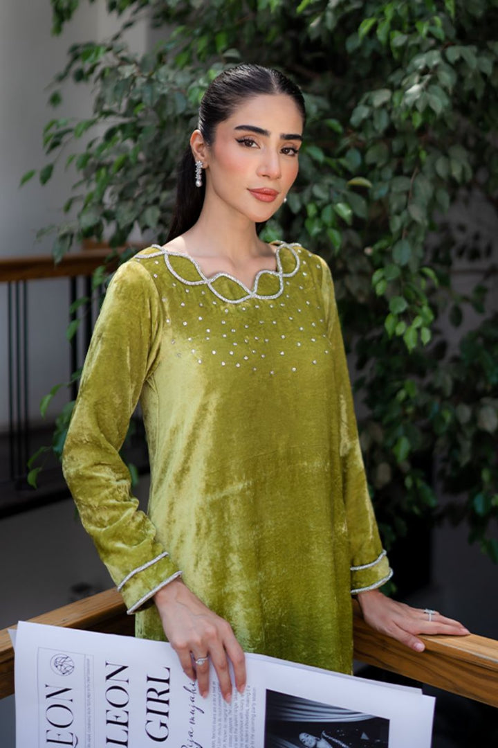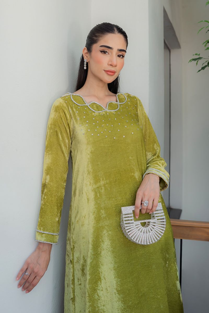 Matcha Lime: A bold blend of neon lime and luxurious velvet, featuring a statement embellished neckline, straight shirt paired with sleek Korean silk cigarette pants. Perfect for redefining festive glamour with a touch of modern elegance.