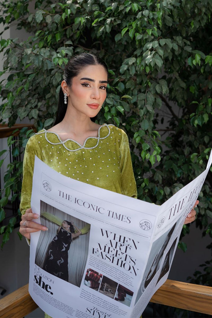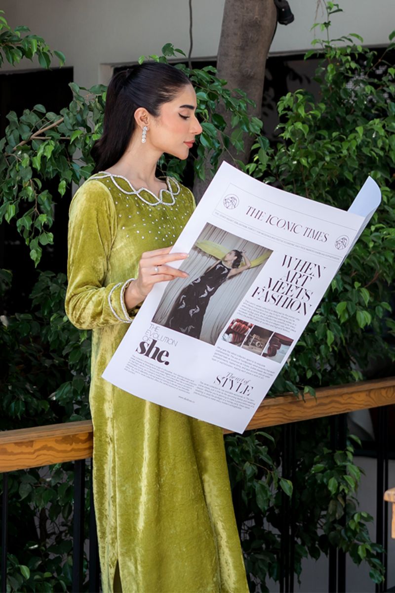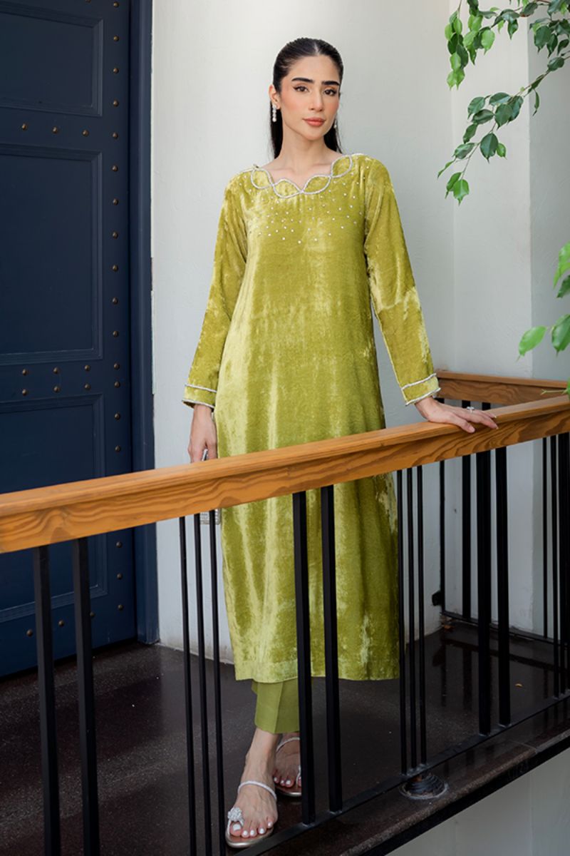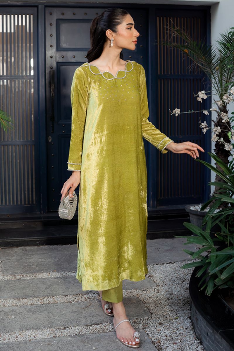 Matcha Lime: A bold blend of neon lime and luxurious velvet, featuring a statement embellished neckline, straight shirt paired with sleek Korean silk cigarette pants. Perfect for redefining festive glamour with a touch of modern elegance.