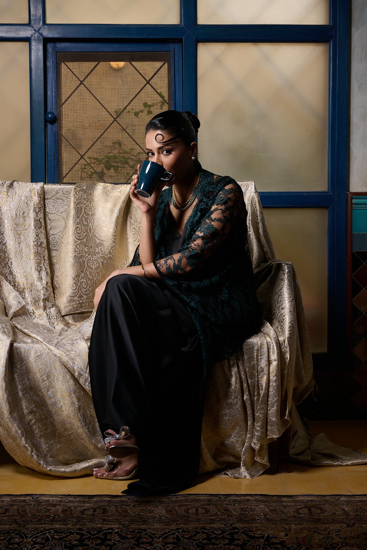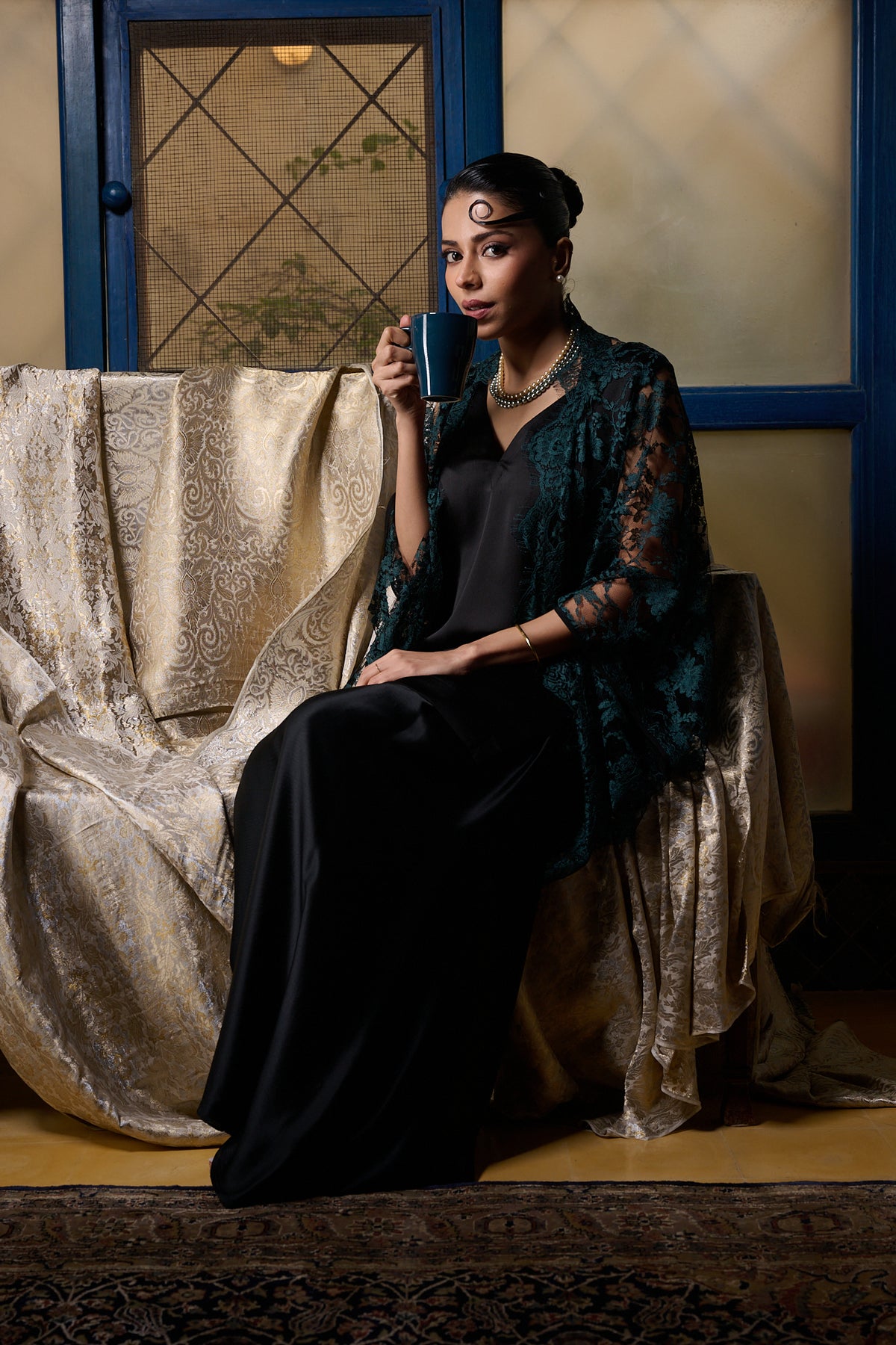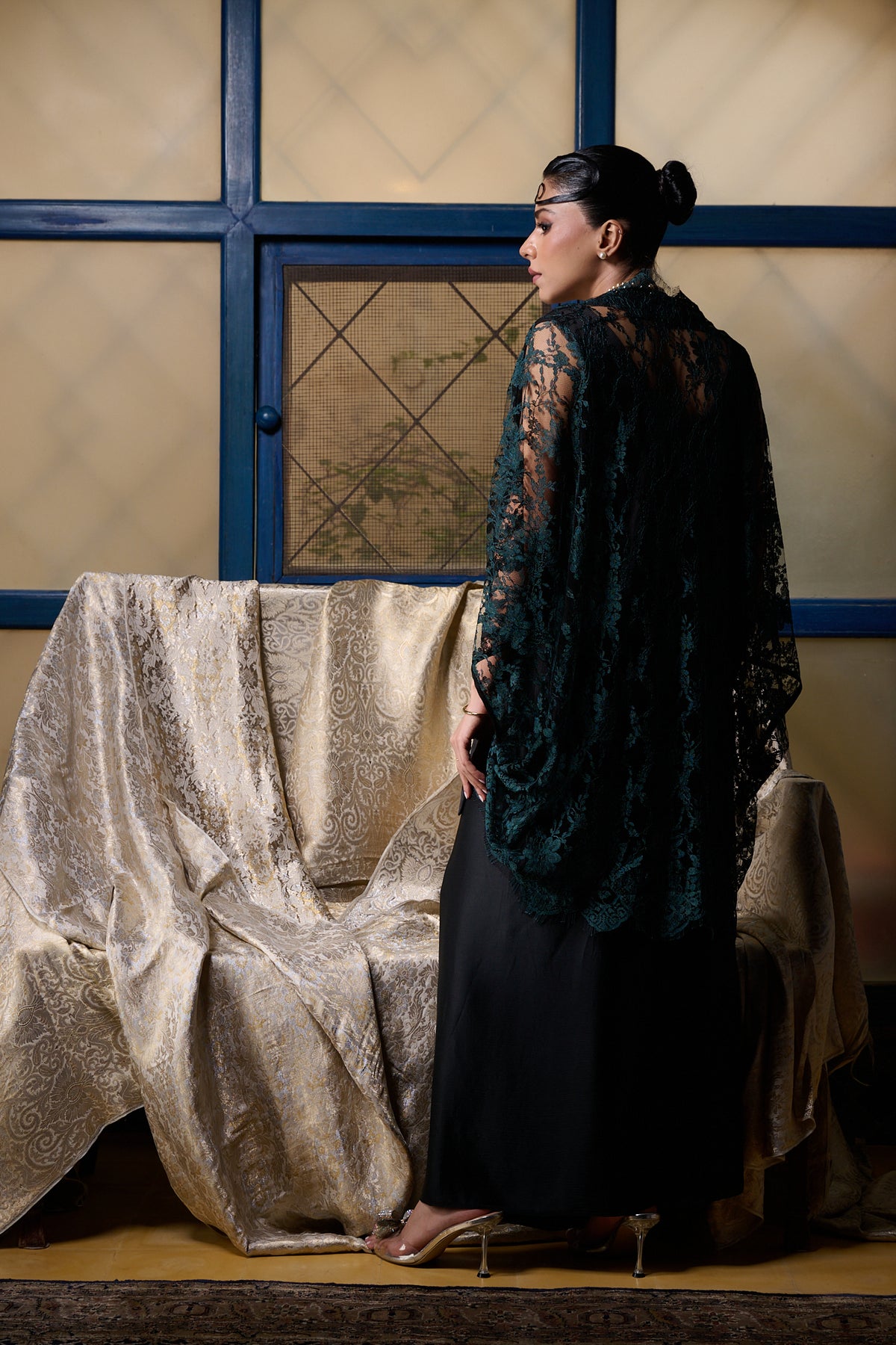 Maheen Khan - Emerald / Black Chantilly Cape Jacket - EMERELED - CHANTILY LACE - 1 Piece