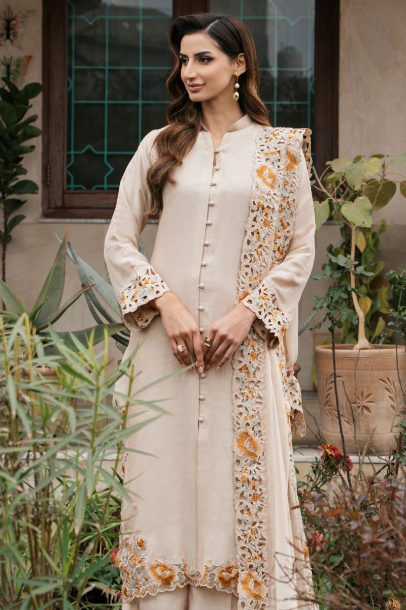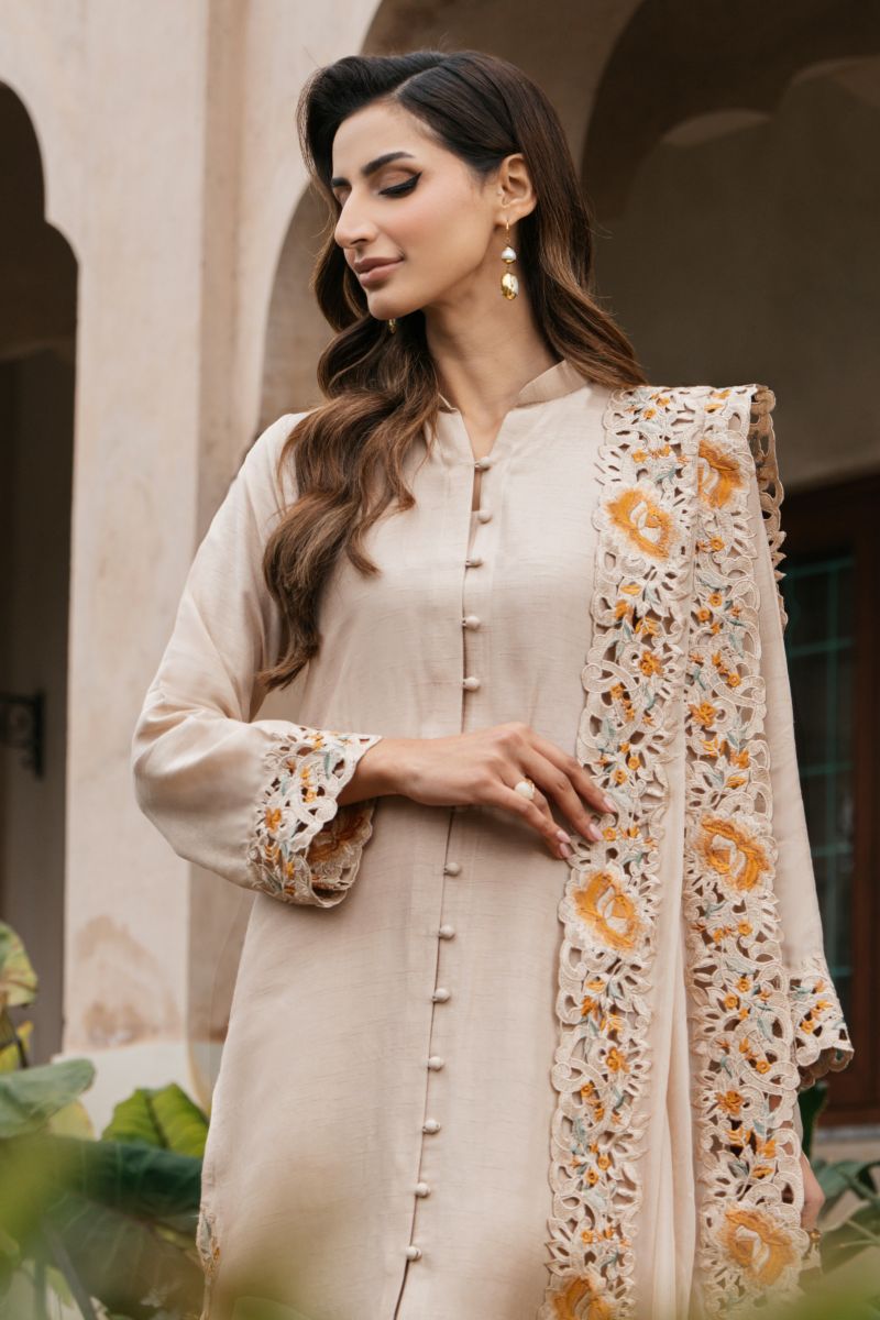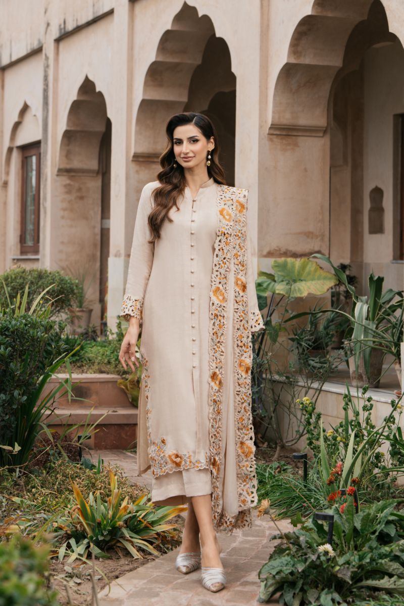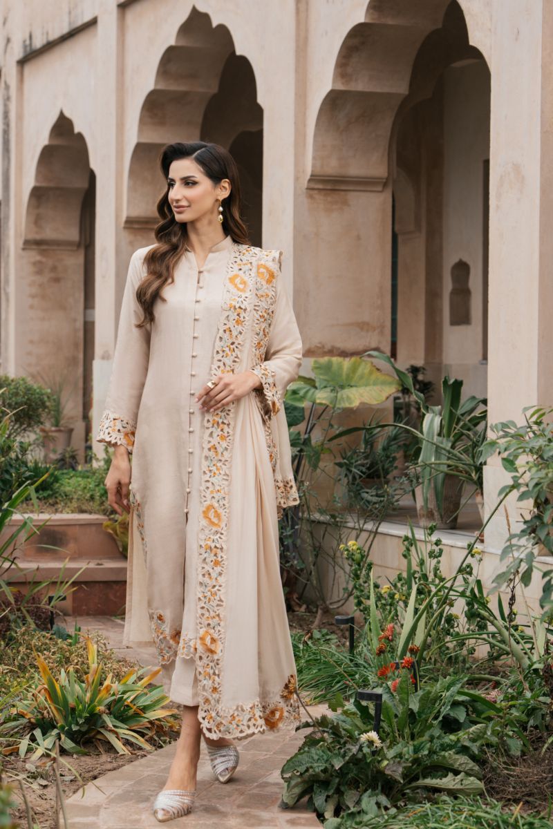 A biscuit long-hemmed canvas is adorned with statement self-embroidered cutwork. Juxtaposed with blooms in hues of mustard, sage and off white to offset this front open monochromatic silhouette. Featuring filigree across the daman and sleeves. It is perfectly suited to the season's events, it is the go-to piece for any occasion.