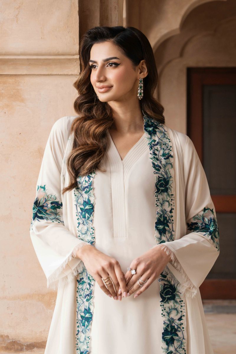 Lean into a romantic mood this season with the 'IDA'. A classic parfait nude is the ultimate canvas for a long hemline offset by cascading vines accented with little embroidered blossoms in hues of sage, sea green, aqua and midnight blue . Exuding delicate femininity with our scalloped detailing along the dupatta borders.