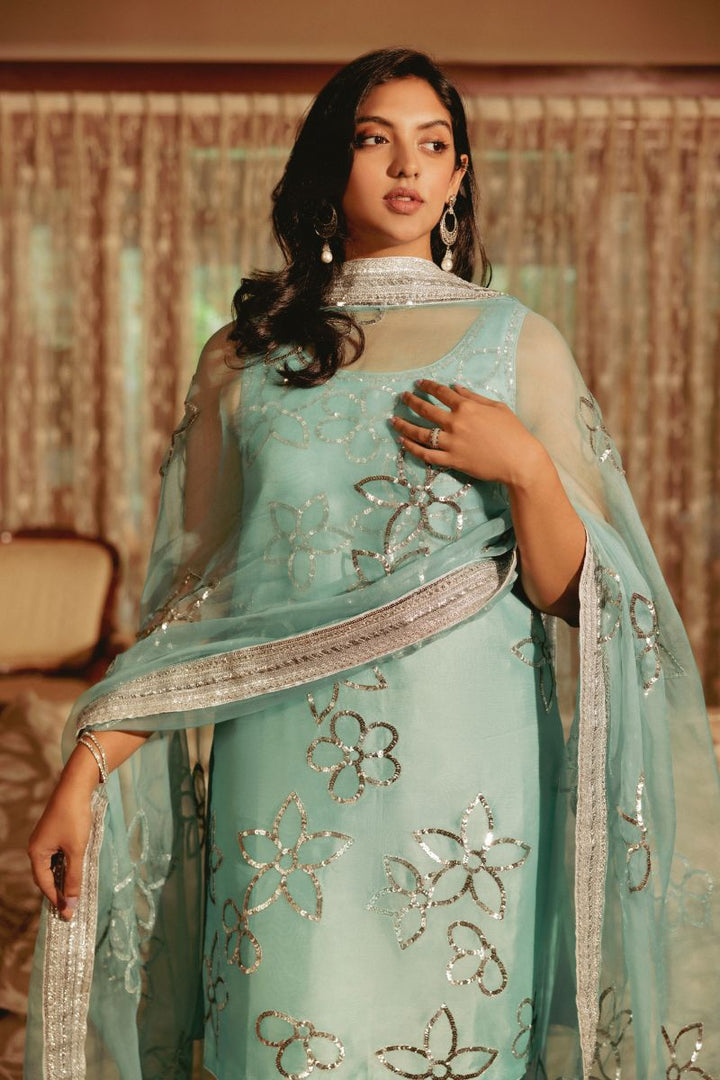 This elegant ice blue pure silk shalwar kameez set features a stunning all-over sequins floral pattern, adding a touch of shimmer and sophistication. The lightweight fabric drapes beautifully, making it comfortable for any occasion. Paired with a matching dupatta, this outfit combines traditional charm with a modern aesthetic, perfect for festive events.