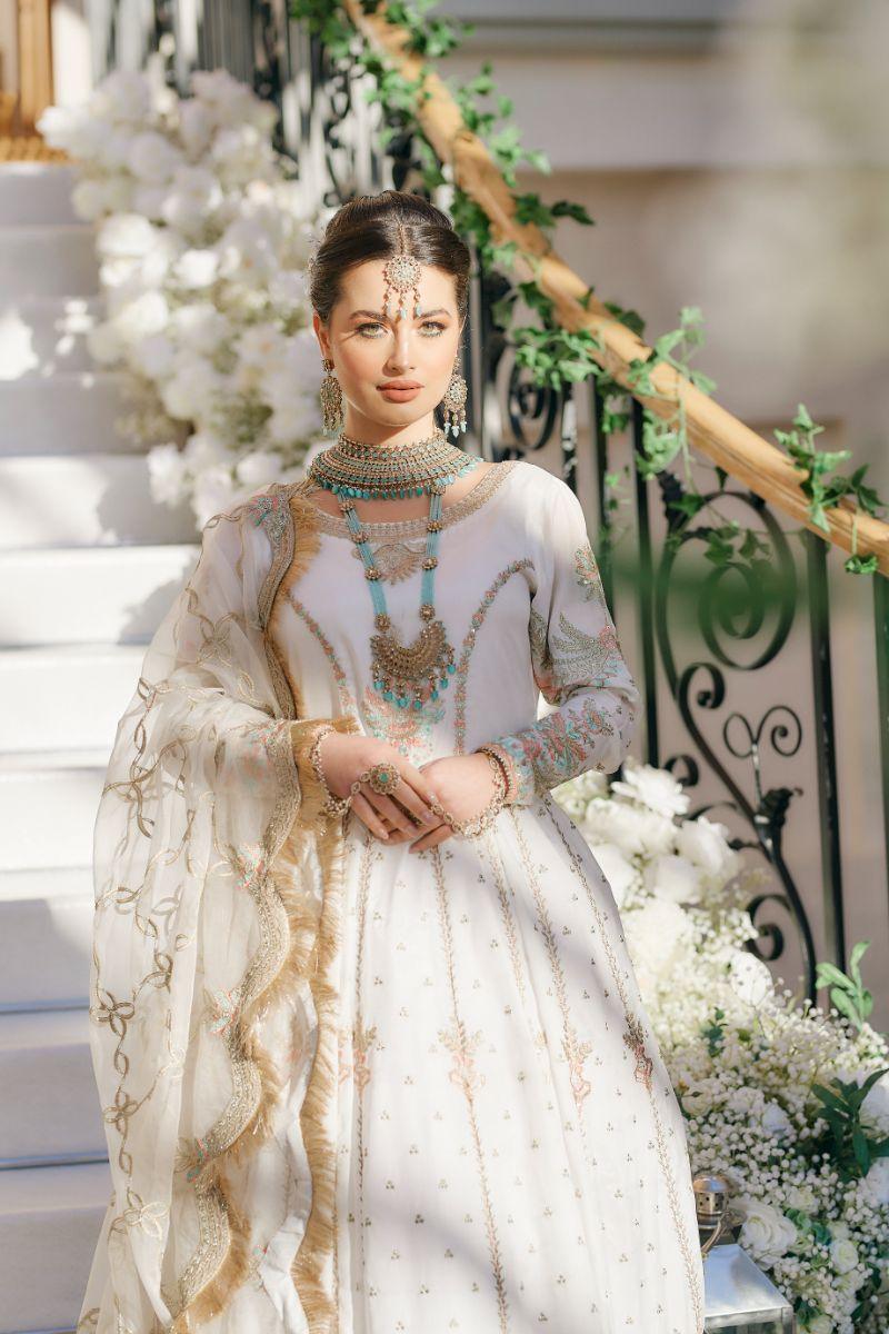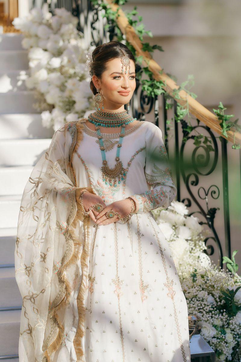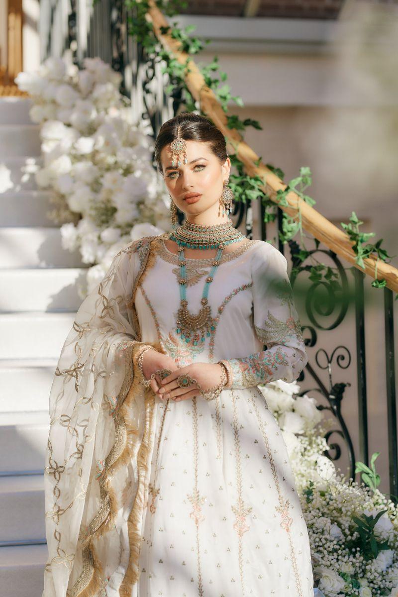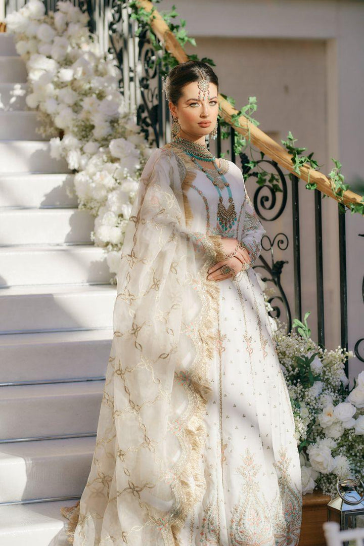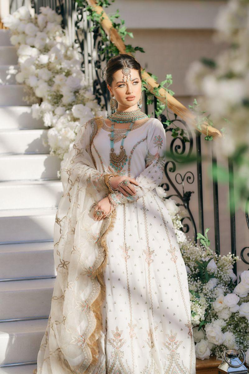 This elegant white attire exudes timeless perfection and is ideal for nikkah ceremonies. The ensemble features a white pishwas perfectly paired with a delicately embroidered border organza dupatta decorated with an embroidered jaal with resham and sitara work completes this eye-catching classy look.