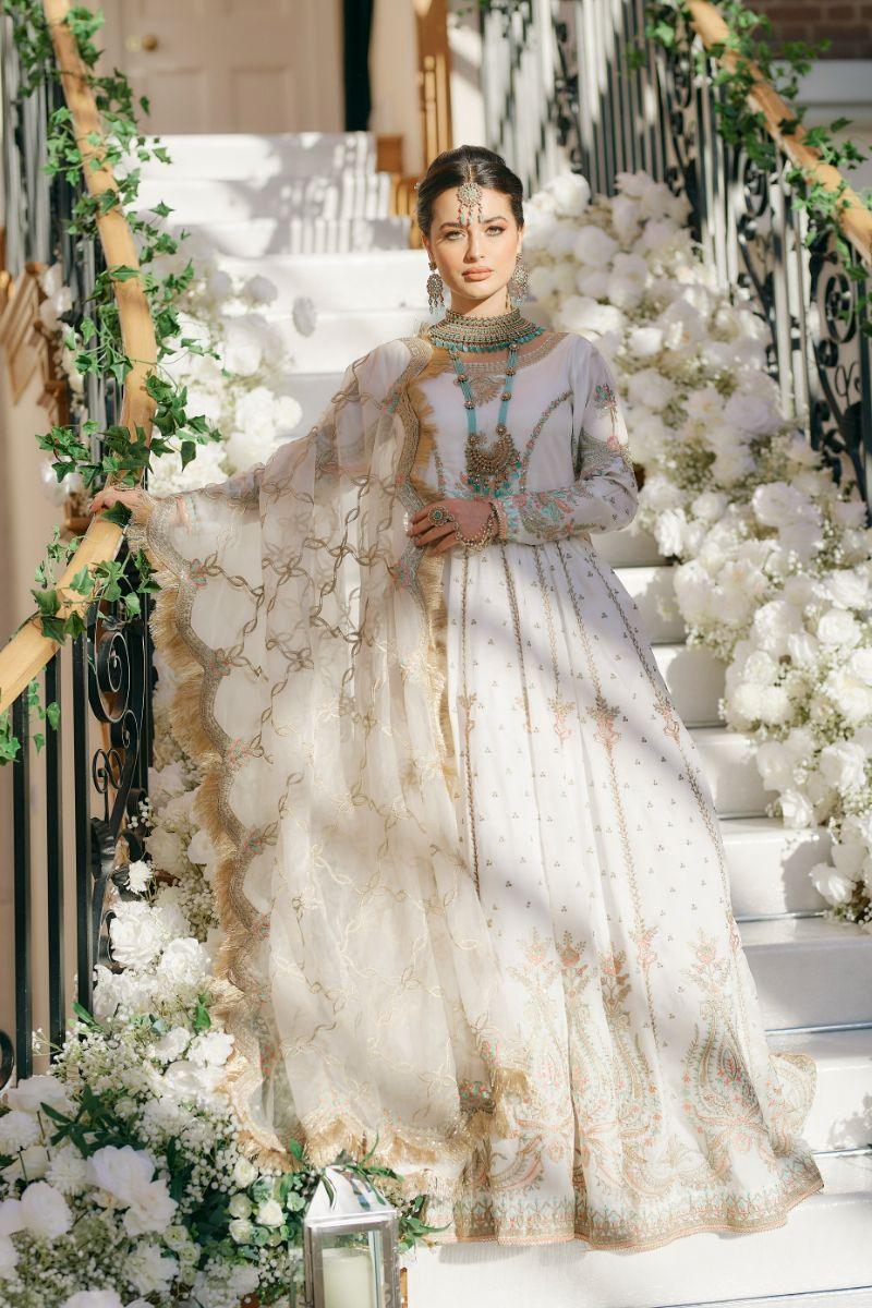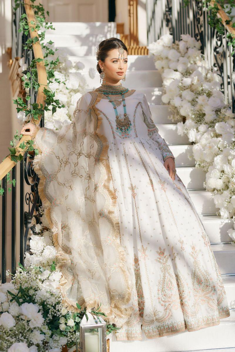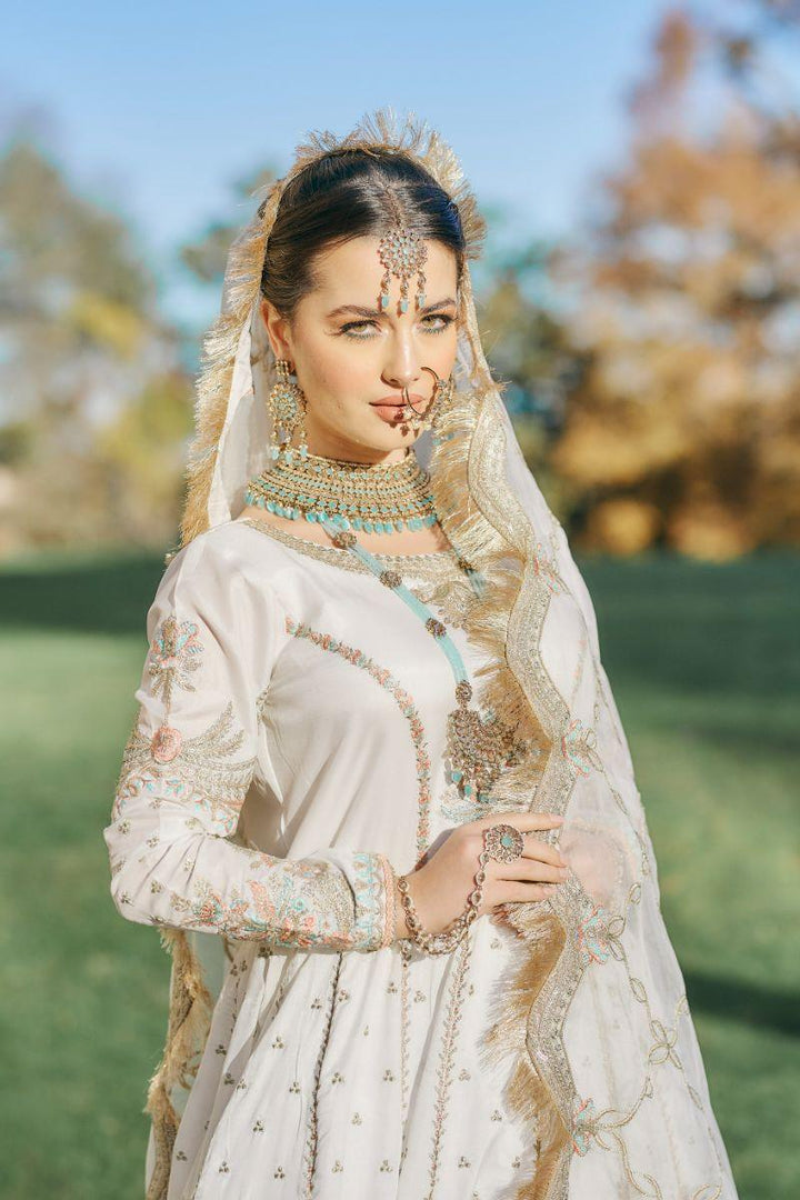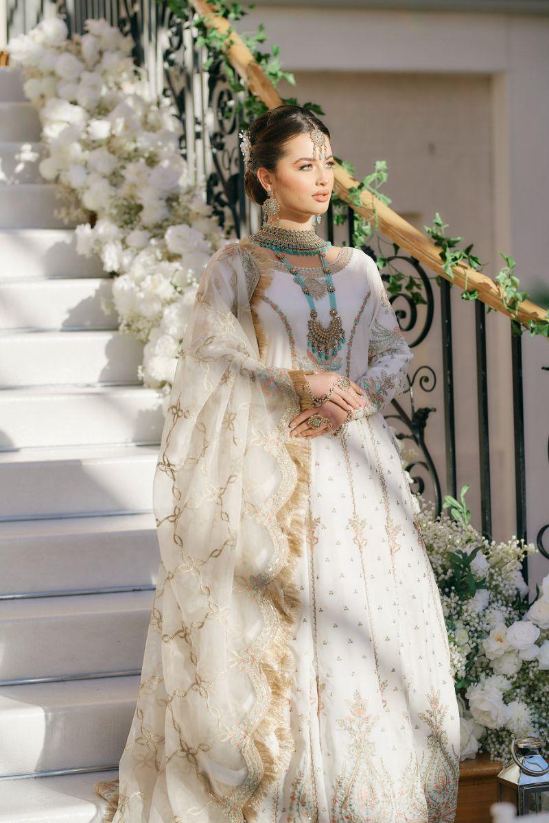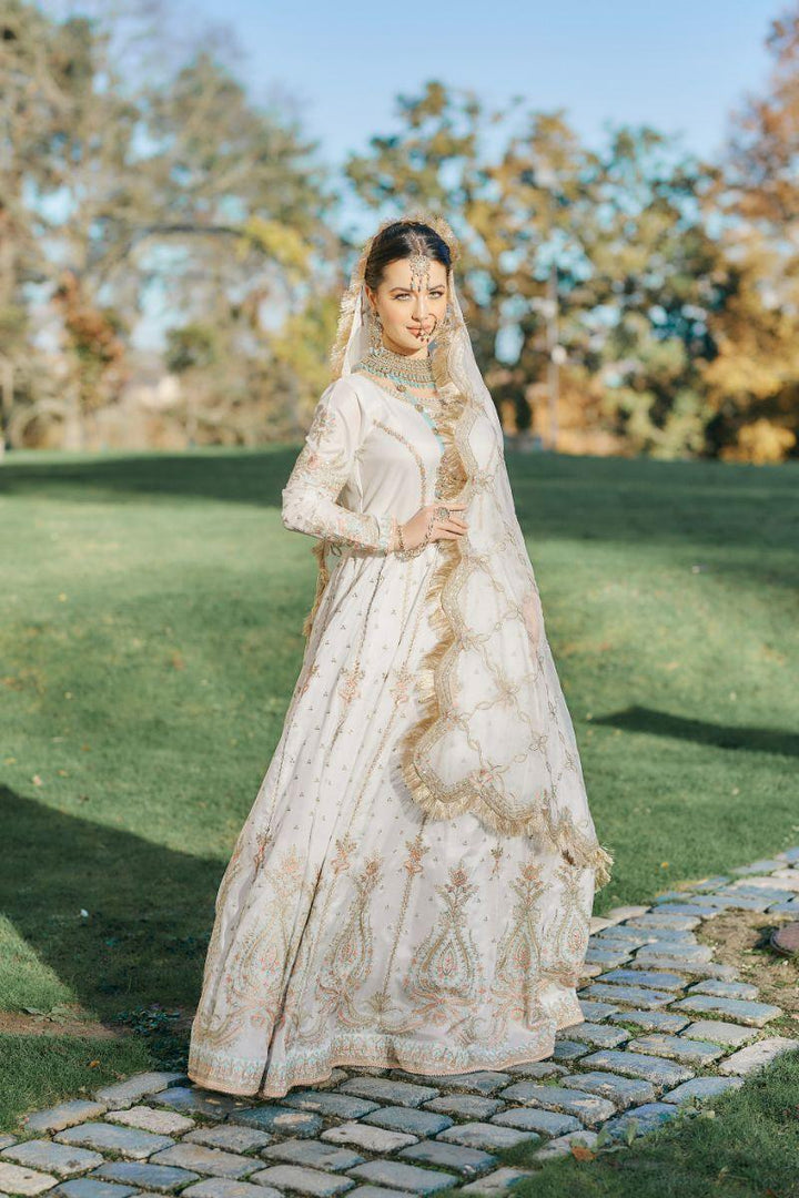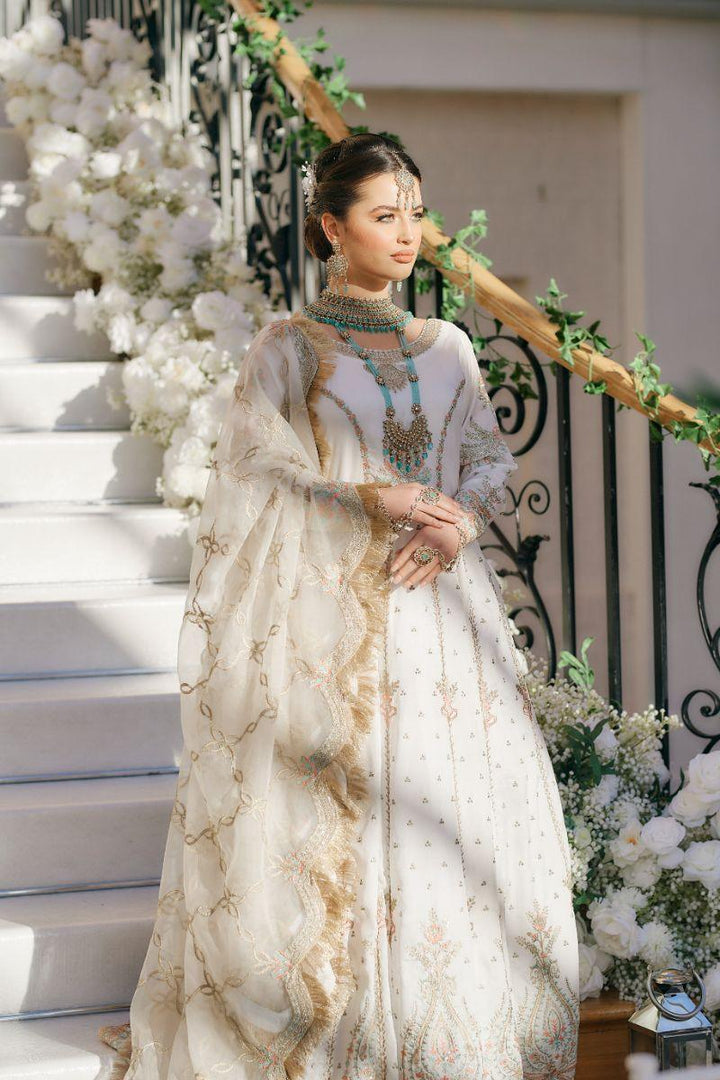 This elegant white attire exudes timeless perfection and is ideal for nikkah ceremonies. The ensemble features a white pishwas perfectly paired with a delicately embroidered border organza dupatta decorated with an embroidered jaal with resham and sitara work completes this eye-catching classy look.