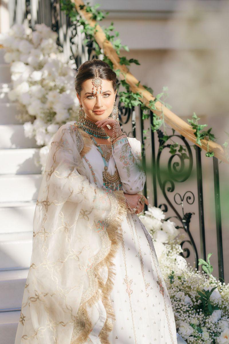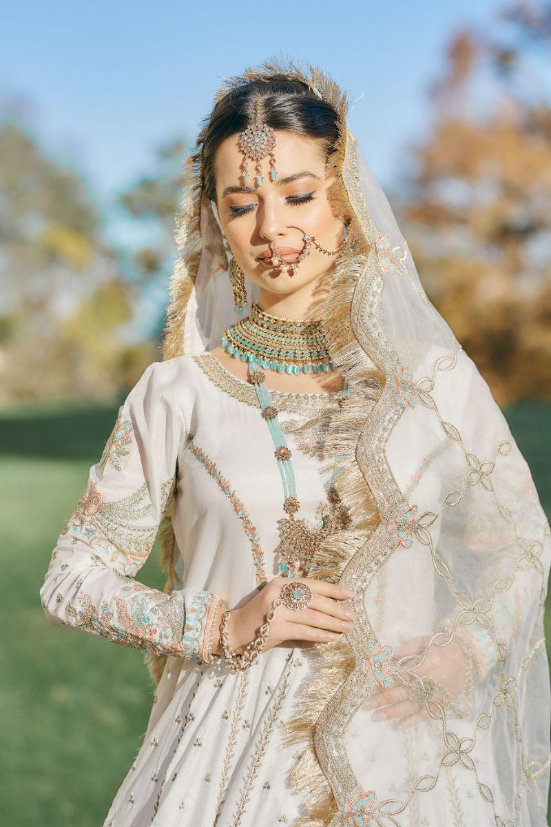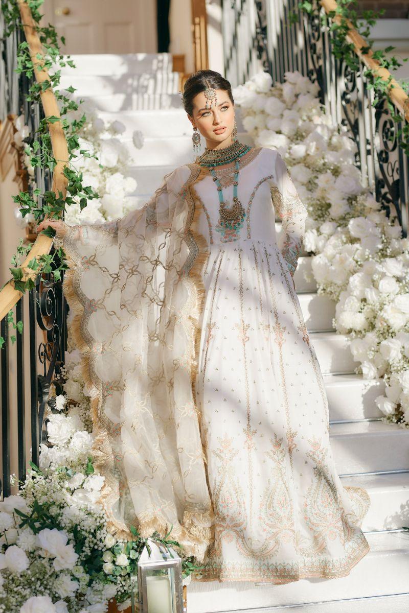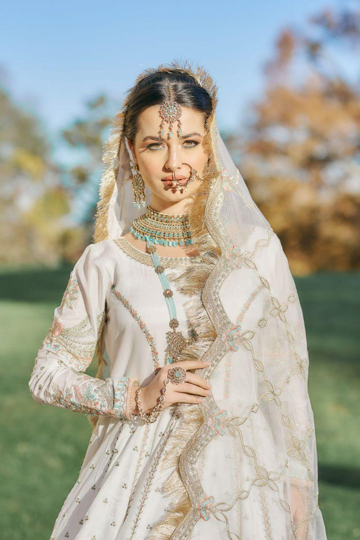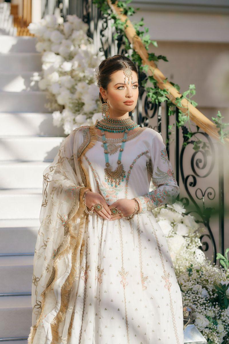 This elegant white attire exudes timeless perfection and is ideal for nikkah ceremonies. The ensemble features a white pishwas perfectly paired with a delicately embroidered border organza dupatta decorated with an embroidered jaal with resham and sitara work completes this eye-catching classy look.