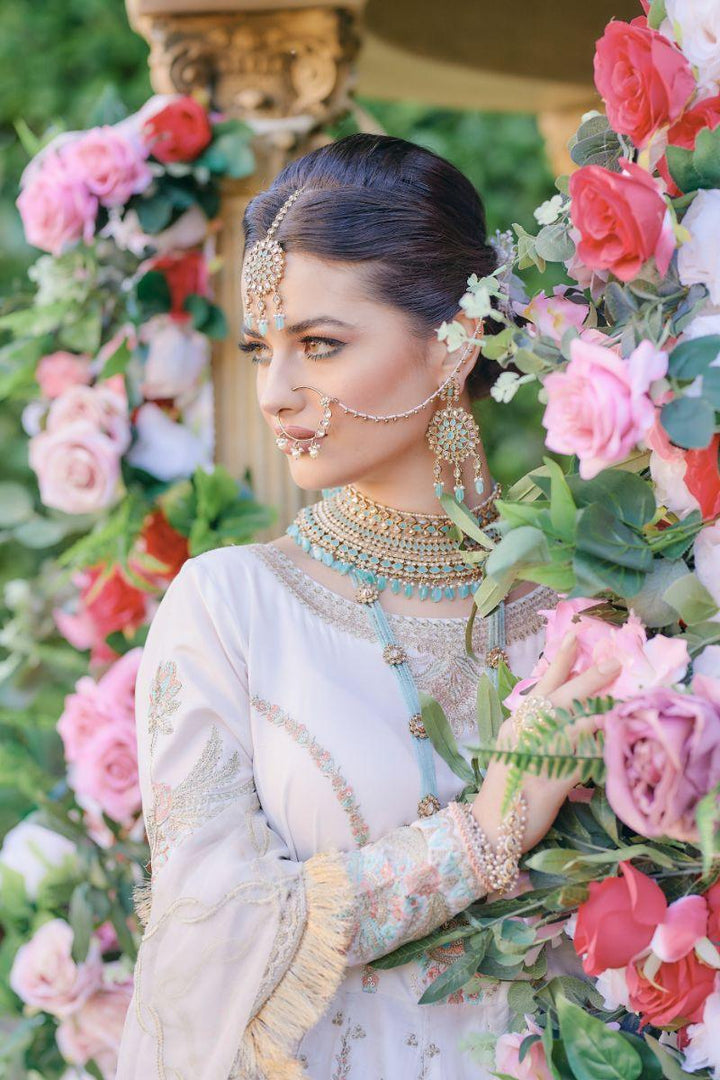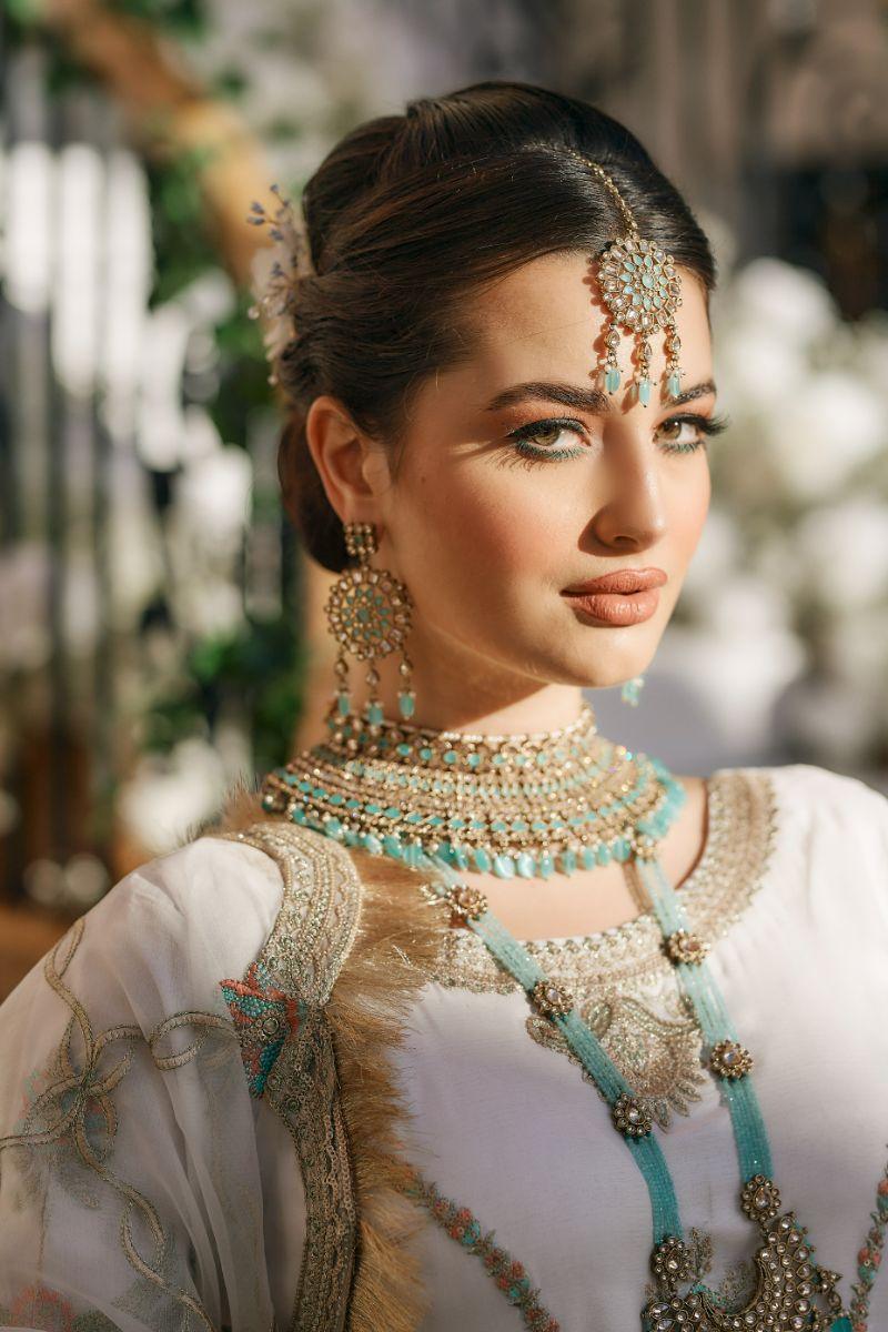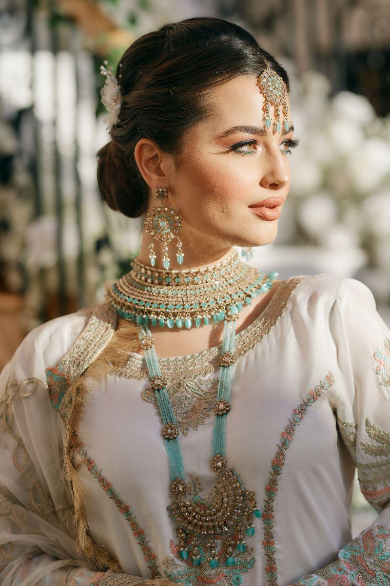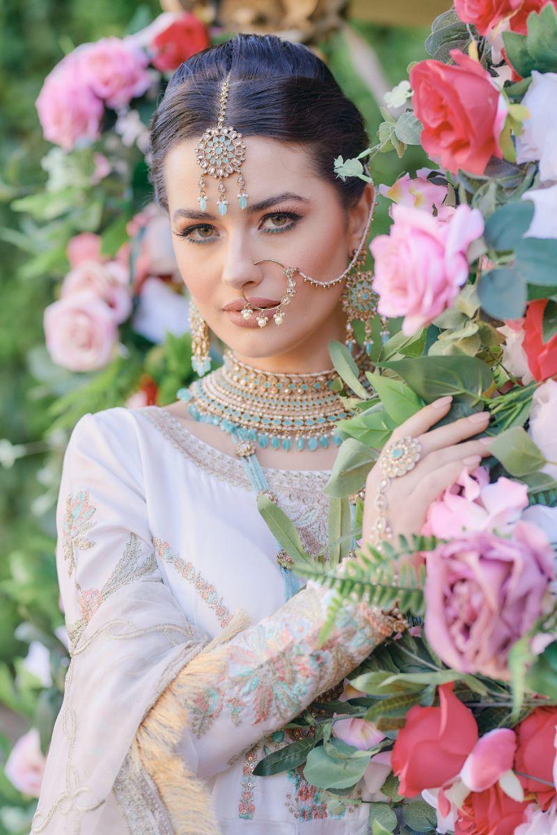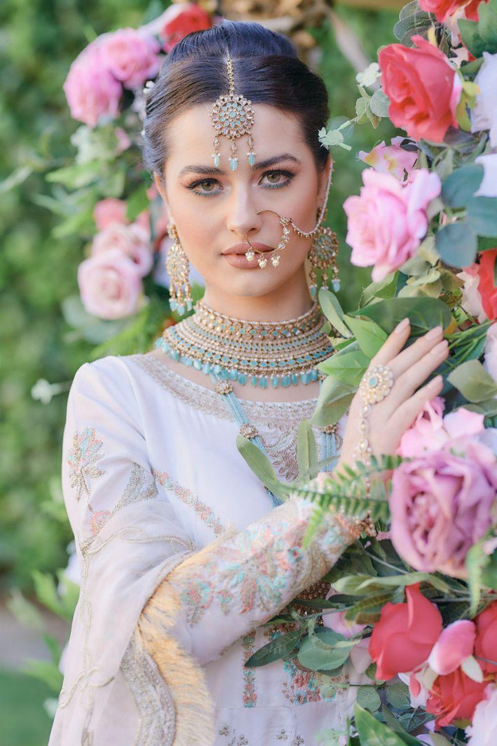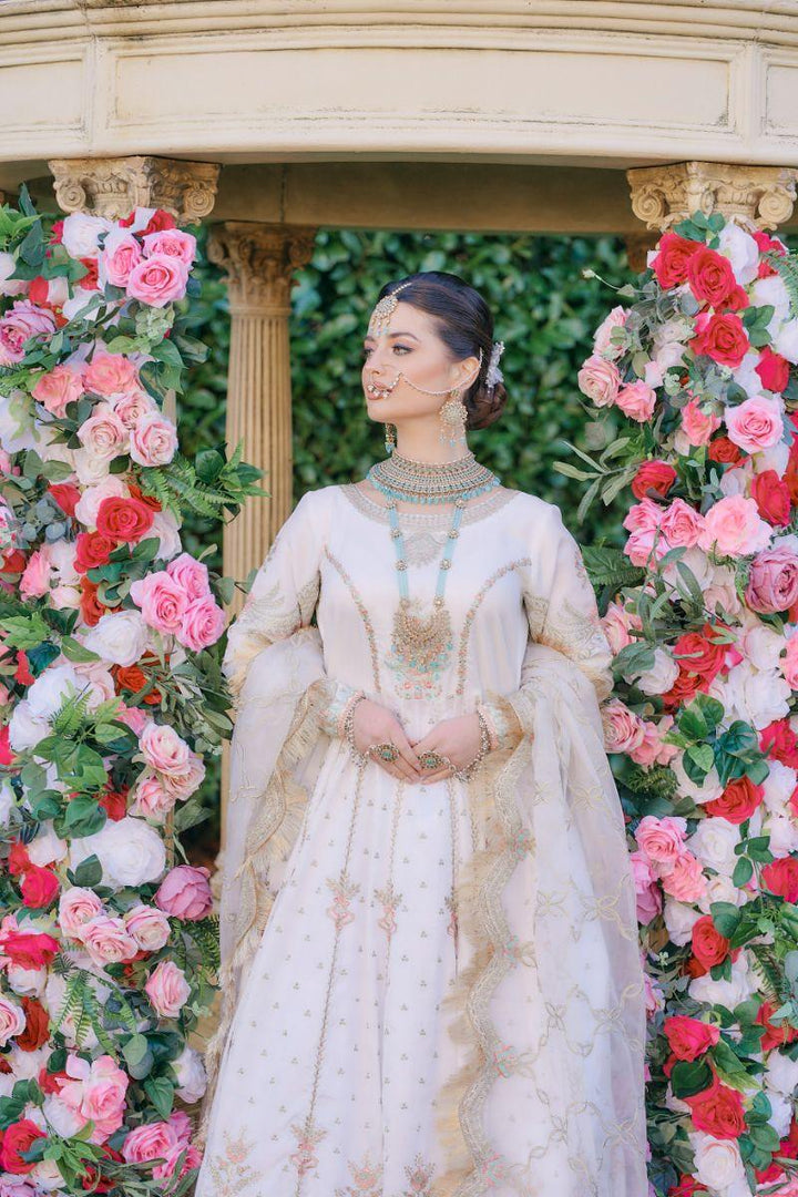 This elegant white attire exudes timeless perfection and is ideal for nikkah ceremonies. The ensemble features a white pishwas perfectly paired with a delicately embroidered border organza dupatta decorated with an embroidered jaal with resham and sitara work completes this eye-catching classy look.