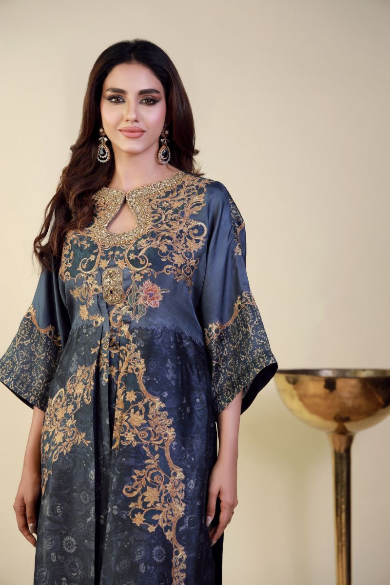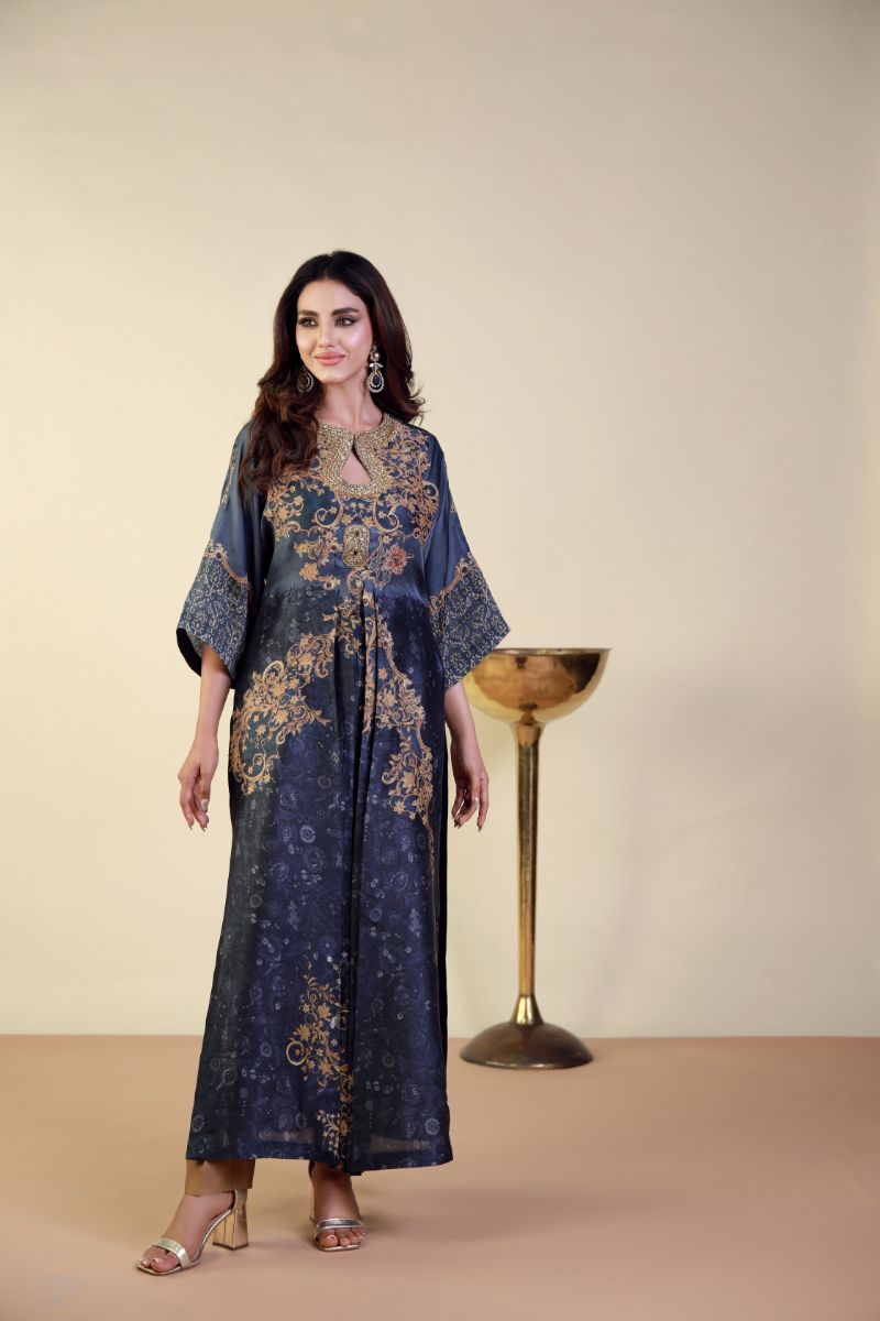 This ensemble is a stunning navy blue outfit adorned with intricate gold embroidery, exuding an air of opulence and refinement. The long, flowing silhouette is accentuated by delicate baroque-inspired motifs that gracefully frame the neckline and cascade down the length of the attire. The wide sleeves, featuring detailed embroidered border, add a contemporary yet regal touch to the design. Crafted from a rich fabric with subtle patterns with gold pant, this ensemble is perfect for evening soirées, festive gatherings, or formal events. The deep hues, coupled with the shimmering gold embellishments, create a striking contrast, making this outfit a timeless statement of elegance and sophistication.