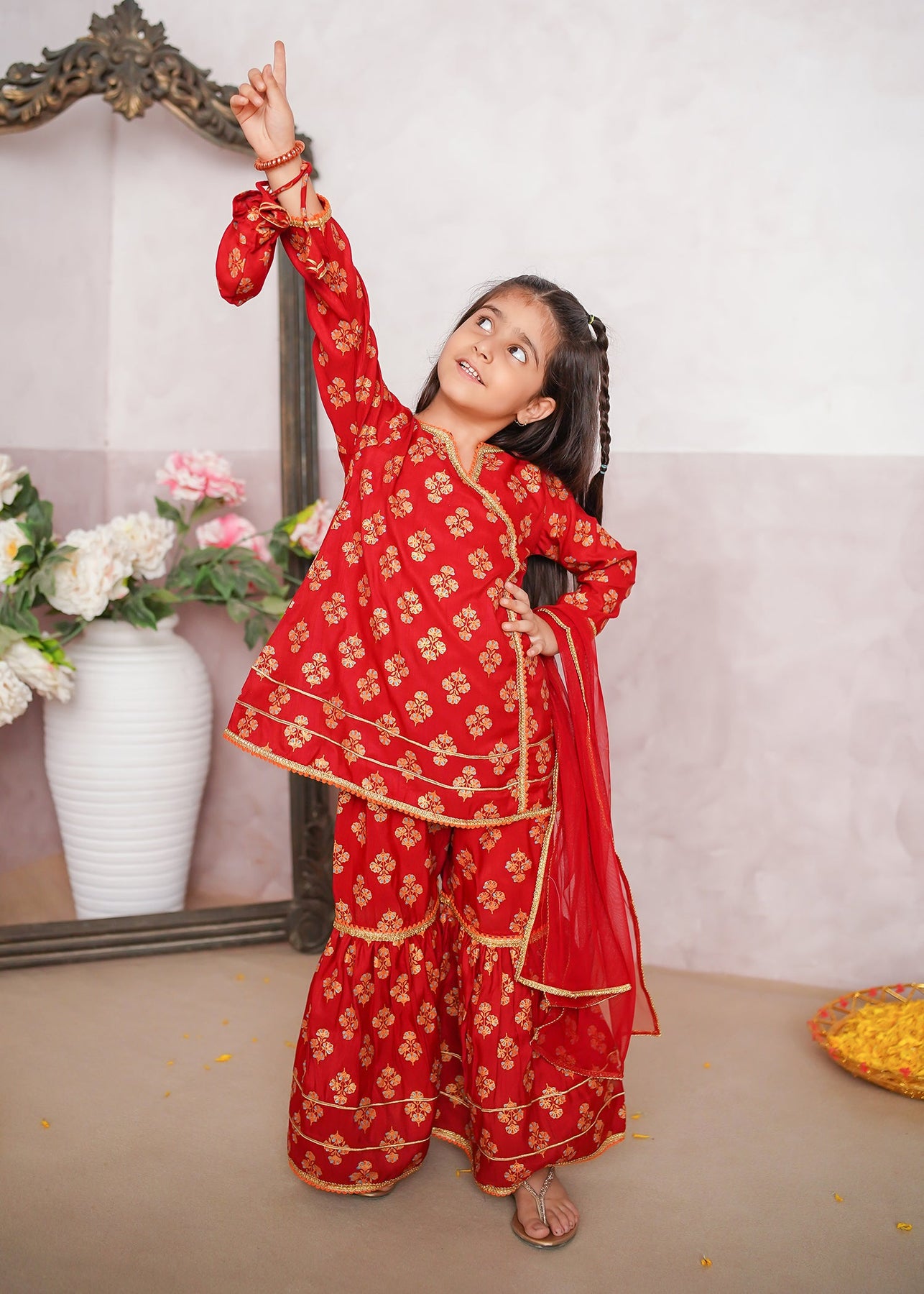 Modest - Rawsilk Printed Gharara Suit For Girl - Red - 3 Piece