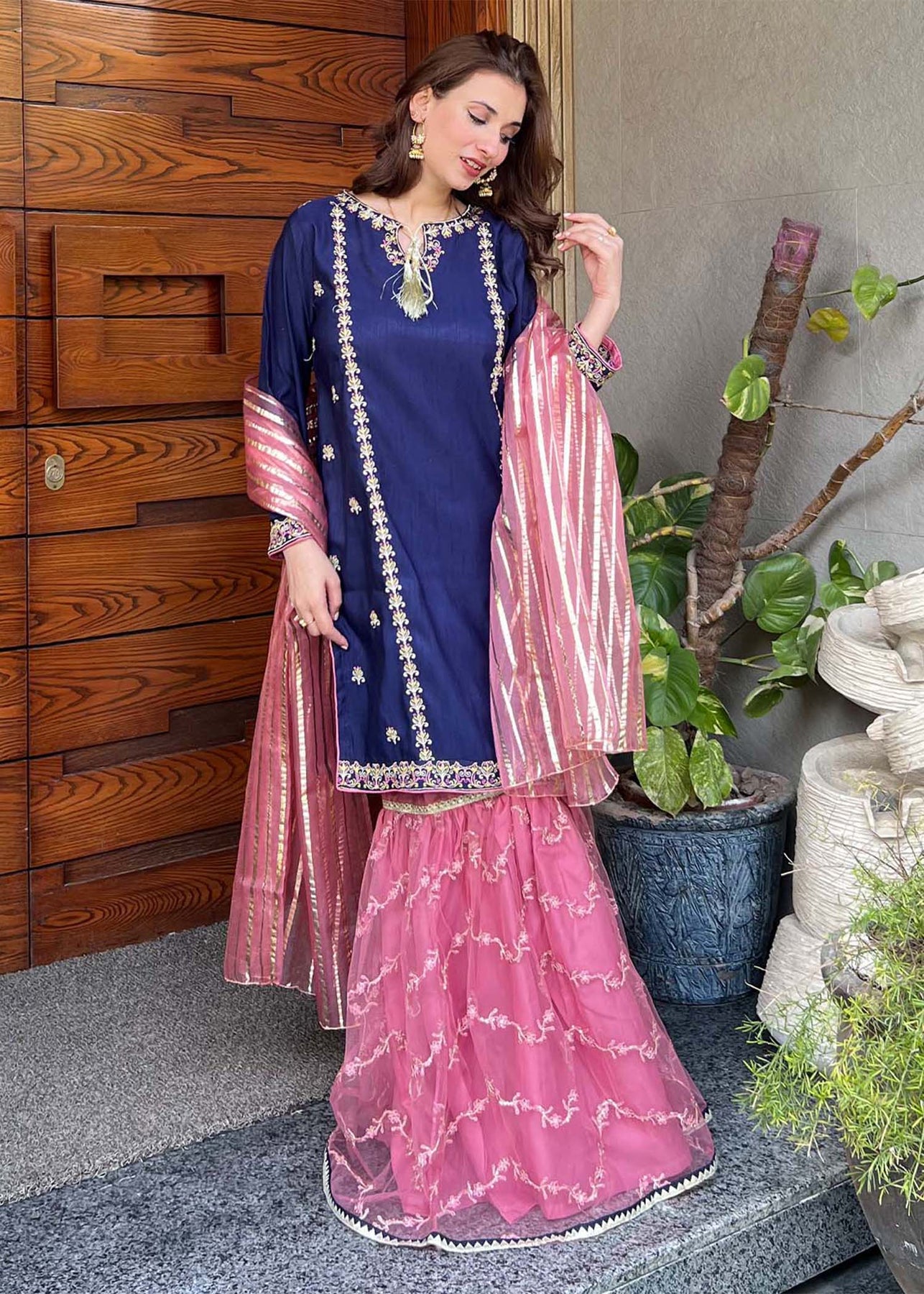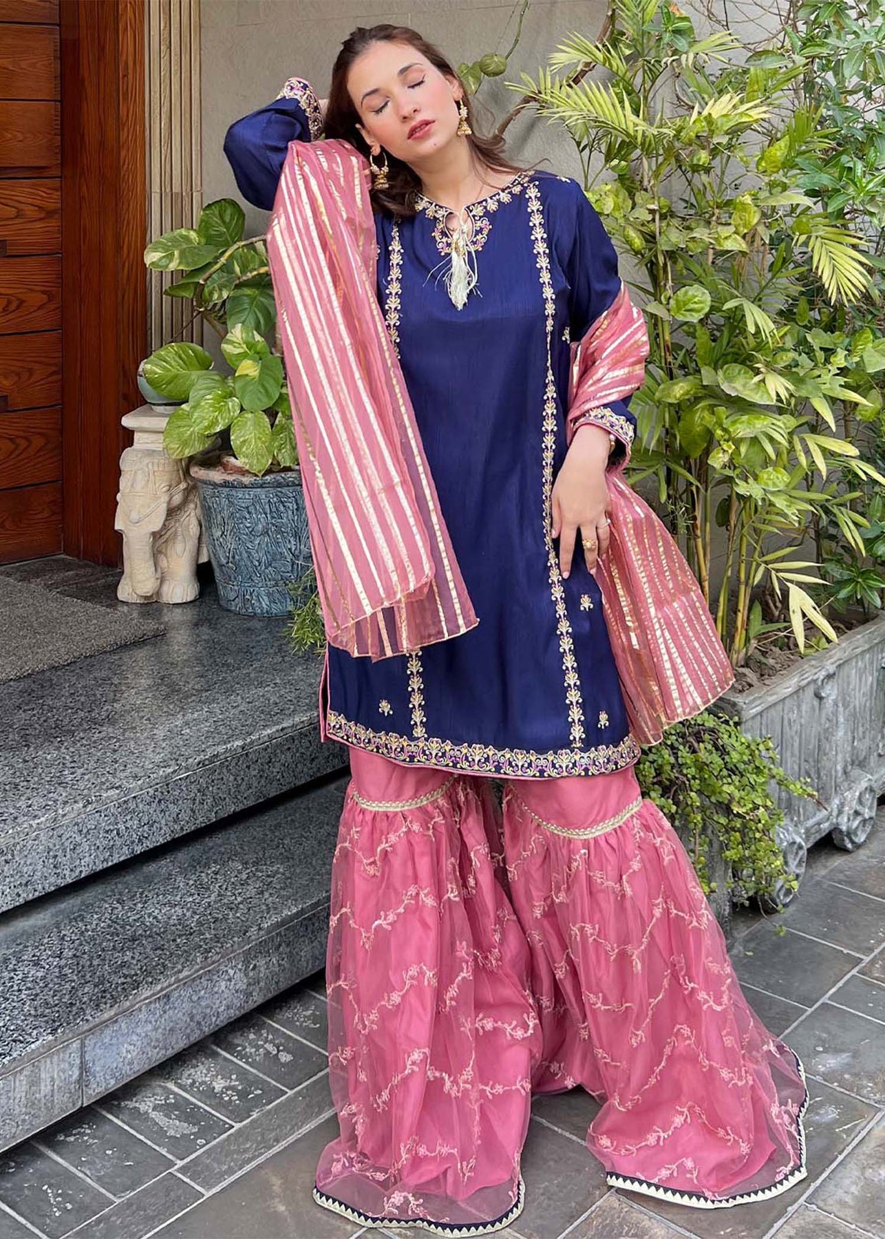 Modest - Gulnoor Rawsilk Gharara Suit For Women - Blue - 3 Piece