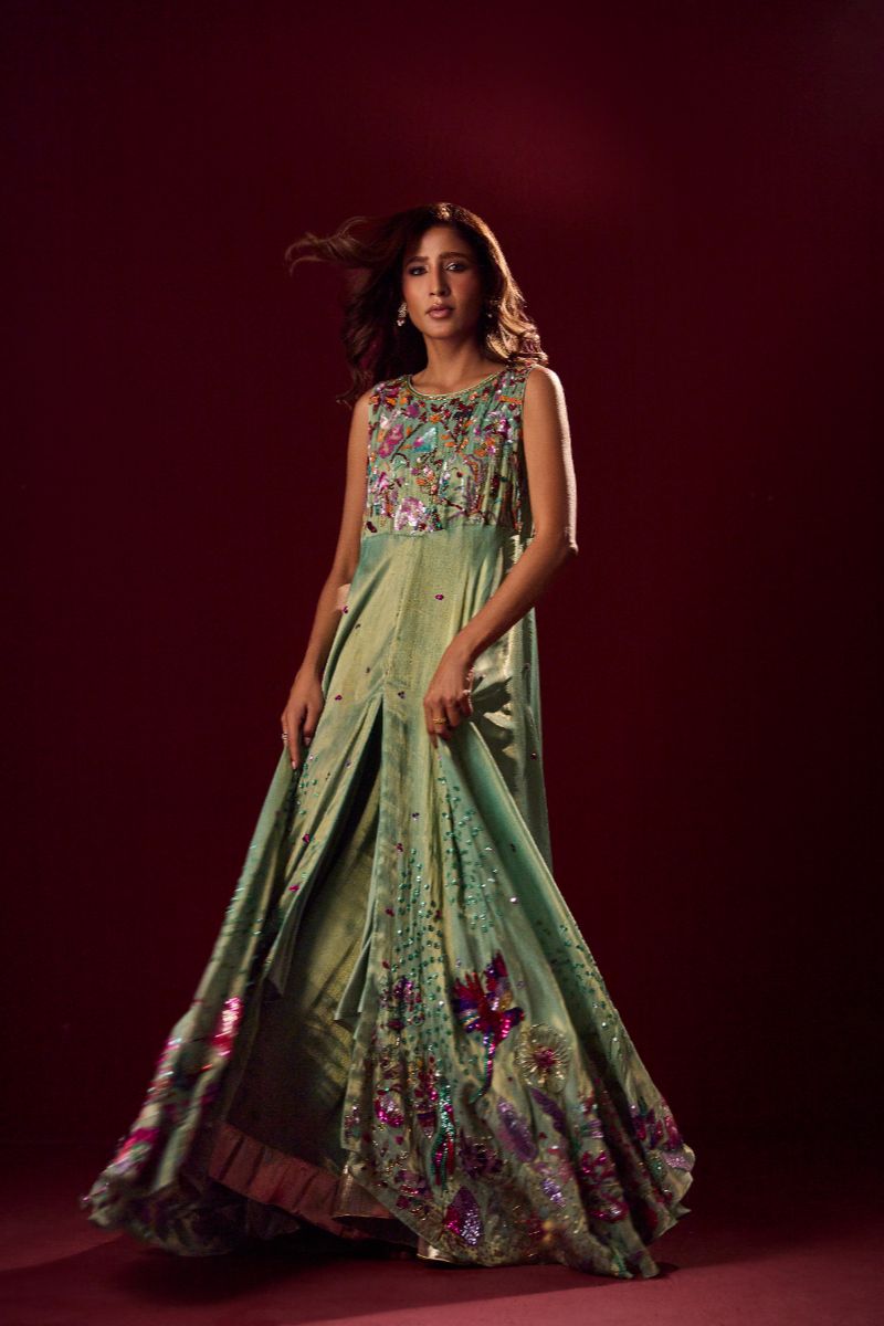 This black velvet shirt exudes elegance with its intricate gold zardozi embroidery on the neckline, daman, and sleeves, complemented by contrasting color highlights that add a bold pop of vibrancy. The luxurious gold work enhances the rich black fabric, creating a sophisticated yet eye-catching design. Paired with hot pink silk culottes, the outfit takes on a contemporary flair. The culottes feature stunning gold bails with green highlights, adding an intricate, bold detail that elevates the ensemble. To complete the look, a purple silk block-printed dupatta drapes beautifully, adding depth and texture with its delicate prints. The combination of black, hot pink, green, and purple creates a dynamic color palette that’s perfect for festive occasions, ensuring a graceful and standout appearance.