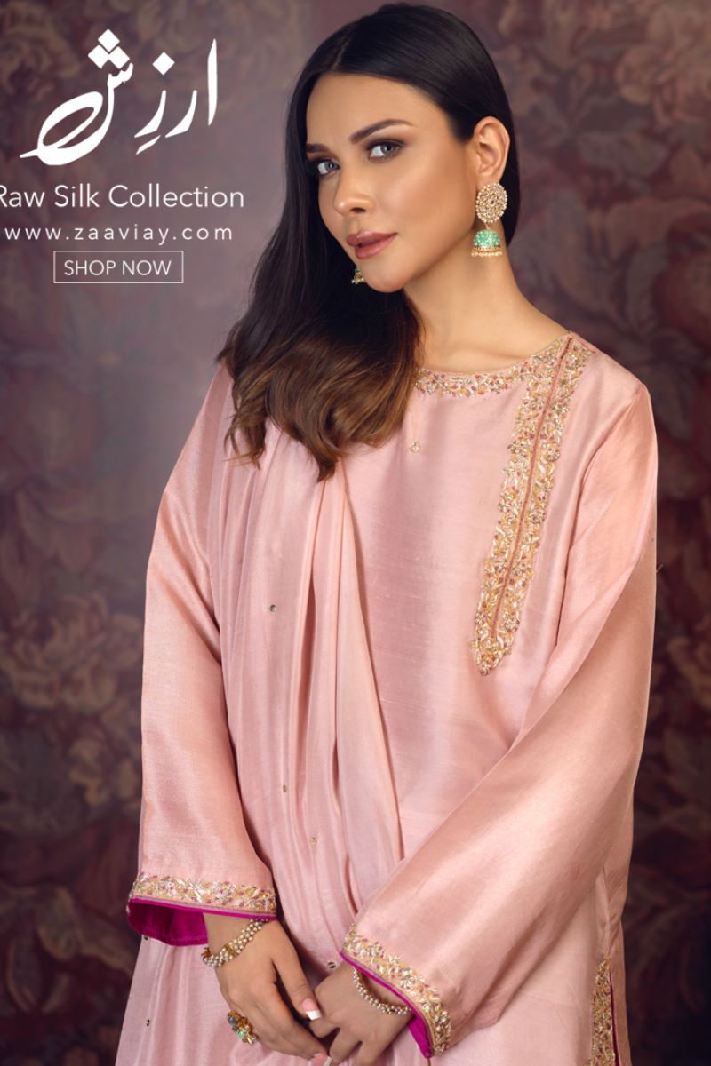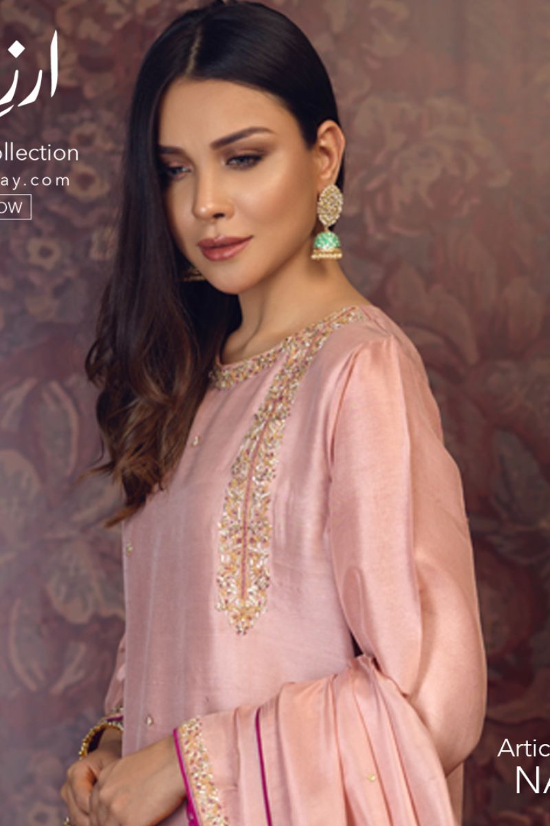 'Nazm' is breathtaking outfit with detailed asymmetrical embroidery with gold kora, zaari and dabka composed on round neckline with detailed embellished slit. To add a pop color to enhance the softness of base color, dark pink hue is added at the finishing on the sleeves and neckline. It is paired with pure silk dupatta with the hand embroidery on the edges to give it appealing look.