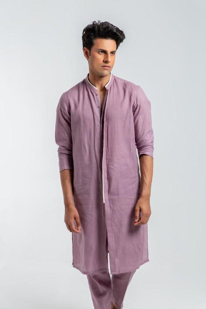 • Lavender long line button down kurta with off-white finishing with matching / off white separates.