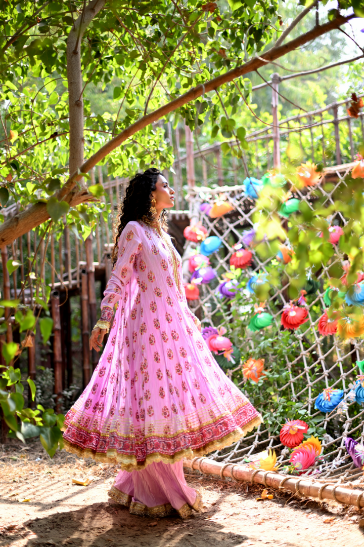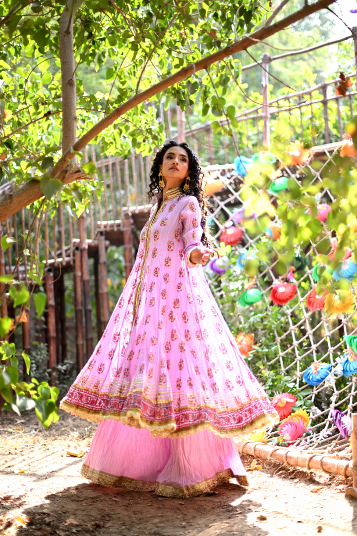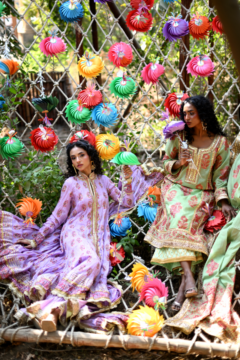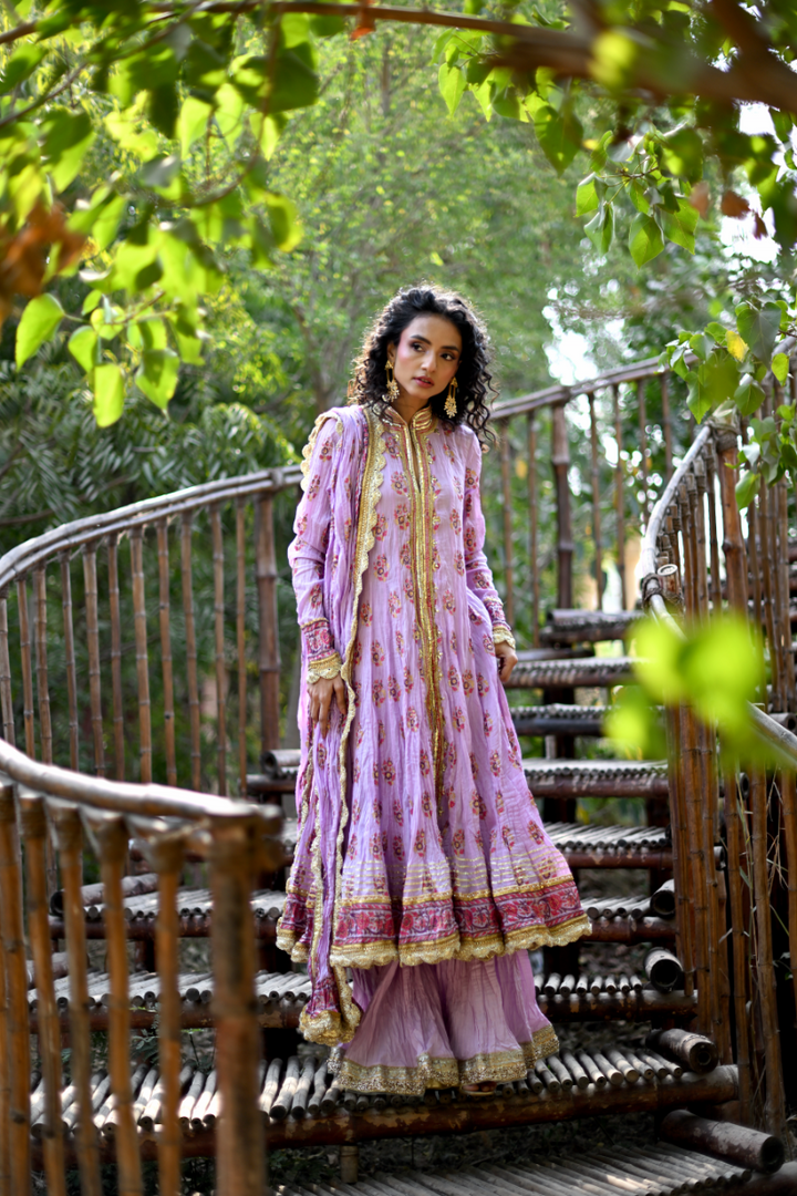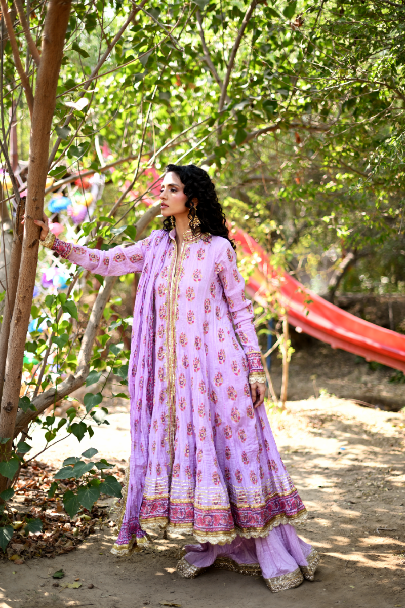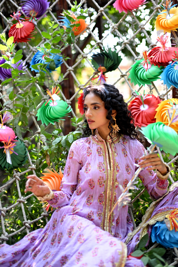 Lilac Horizon is for those who seek a dreamy escape into soft hues and delicate textures, where every step feels like a quiet stroll beneath a lilac sunset. The outfit features delicate lilac malmal adorned with intricately block-printed motifs, evoking the serene allure of a distant horizon. Each pattern is thoughtfully placed, offering a blend of traditional artistry and timeless elegance. The design is further elevated with exquisite gota detailing, which adds a subtle, yet striking shimmer along the edges, enhancing the fluidity of the fabric with every movement. The gota trims offer a touch of refined glamour, creating a perfect balance of heritage craftsmanship and contemporary charm. Finished with subtle yet elegant detailing, this outfit is paired with a matching crushed block-printed dupatta and Dhaka pajama, creating a perfect blend of bold color and graceful charm.