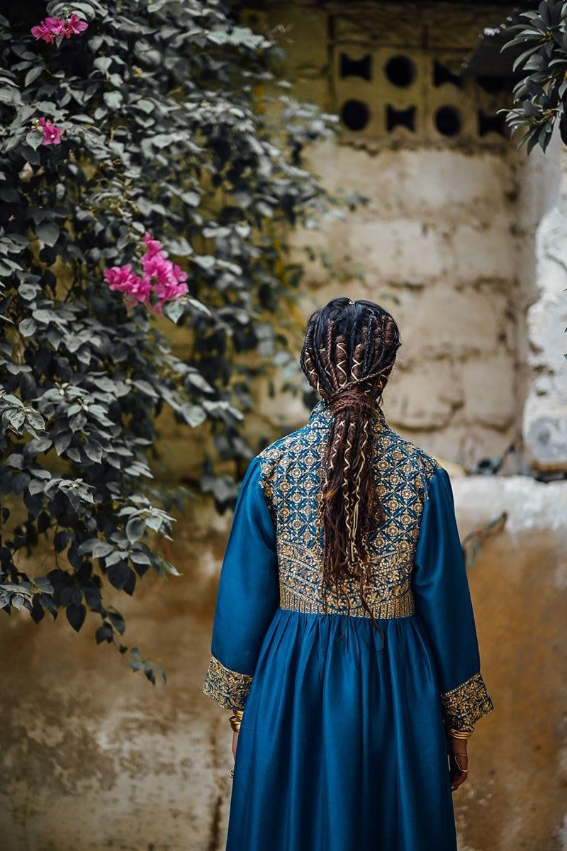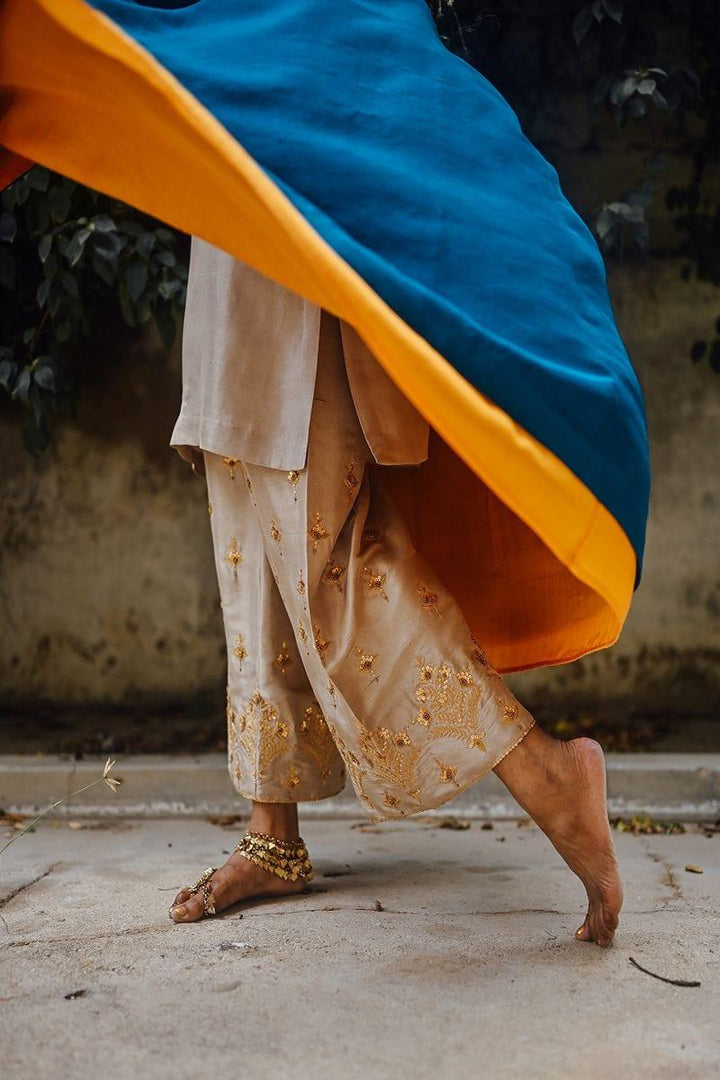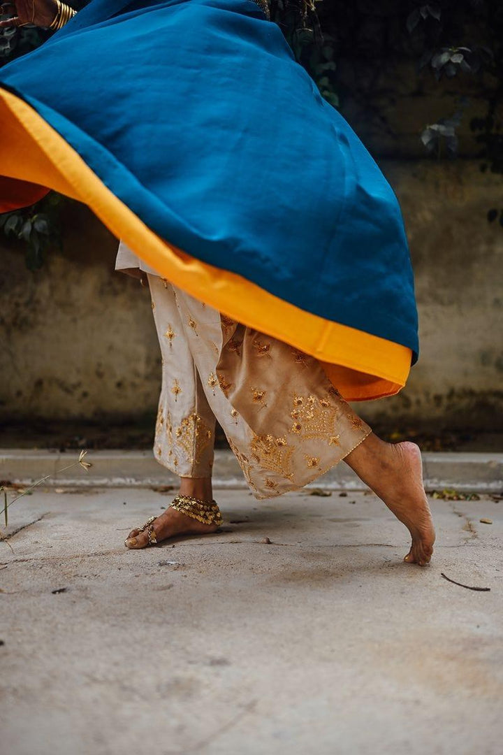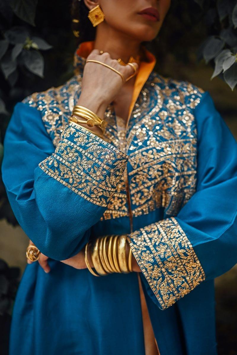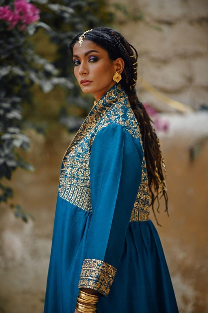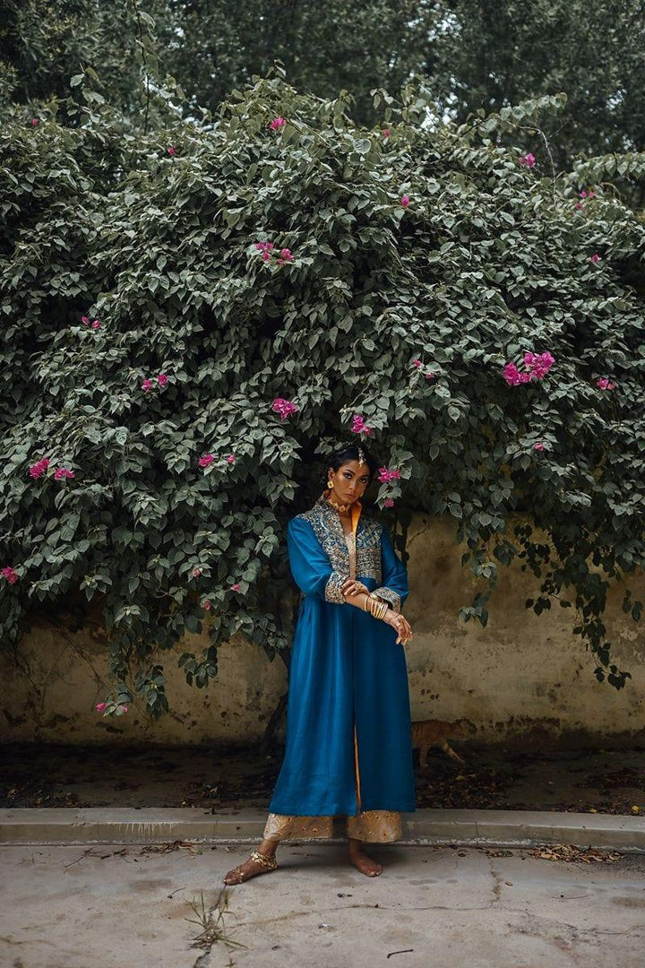 Sanam Chaudhri - Raw Silk Blue Coat with Inner Shirt and Izaar
