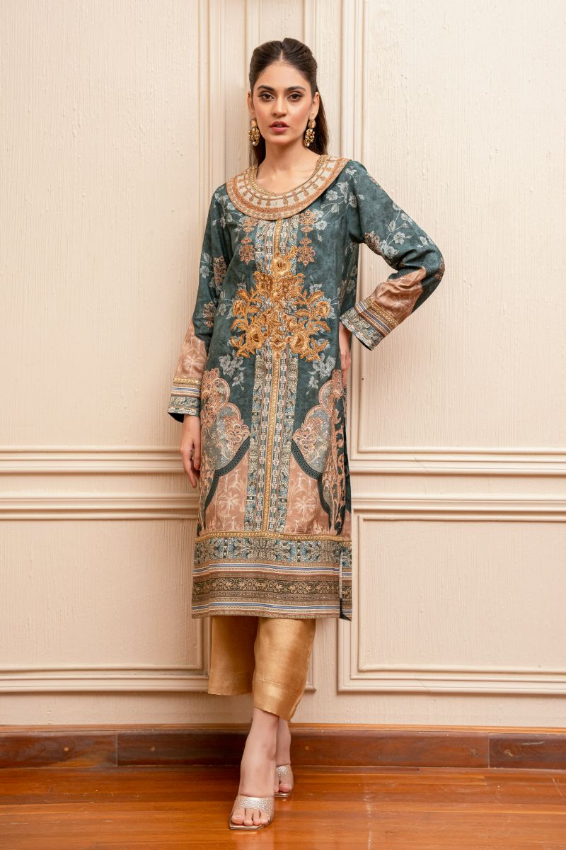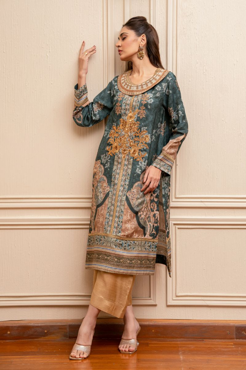Add a touch of elegance to your look with our beautifully embroidered shirt, outlined with intricate tilla work on the neckline. Paired with a plain izaar for a chic and sophisticated contrast. Perfect for making a statement at any occasion! Shirt Fabric: Khaddi Silk Izaar Fabric: Khaddi Silk