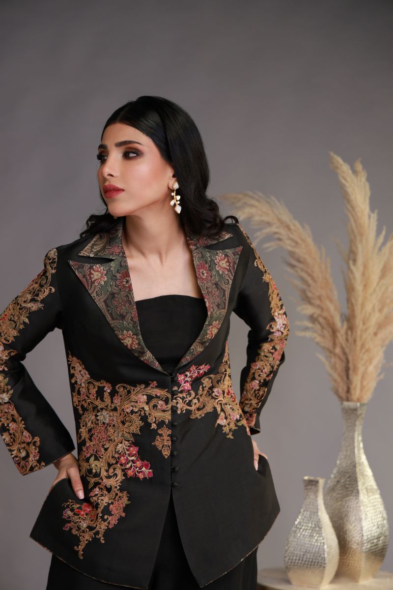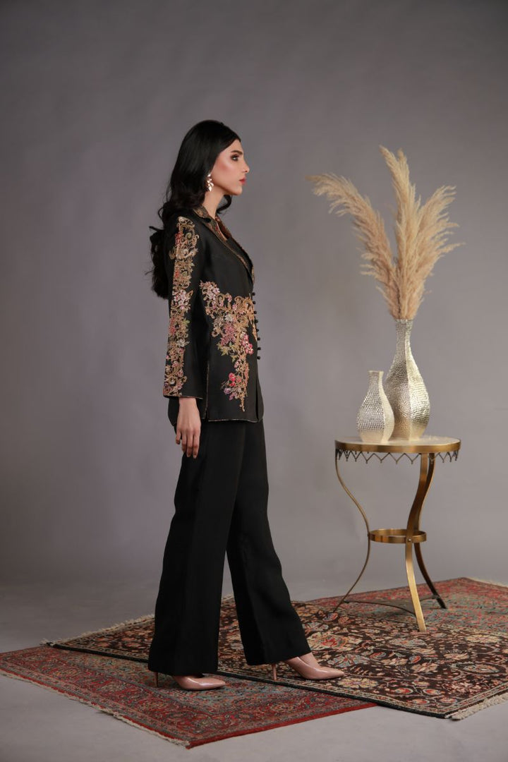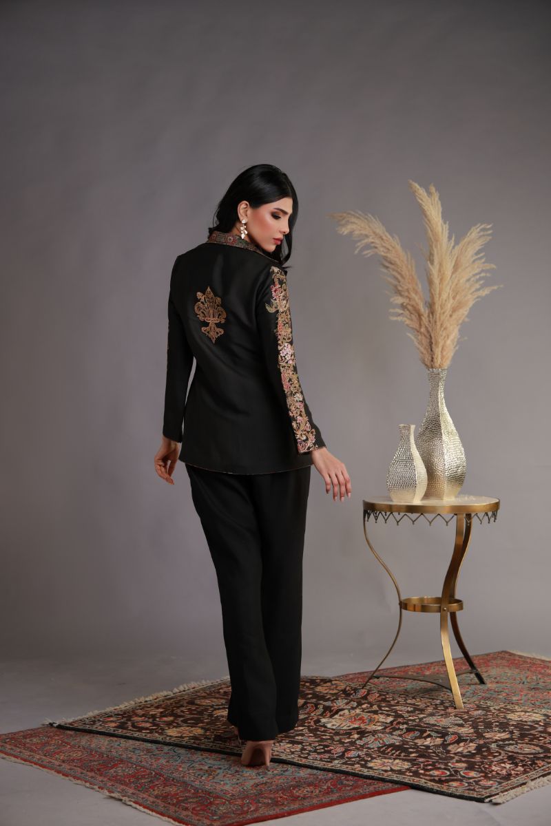 he outfit consists of a chic, tailored black pantsuit adorned with intricate floral embroidery. The jacket features a structured design with a lapel collar, enhanced by colorful and detailed floral patterns in shades of pink, gold, and green. The embroidery adds a luxurious touch, complementing the sleek, minimalistic black trousers that offer a clean and elongated silhouette. This ensemble blends traditional decorative elements with modern tailoring, making it both sophisticated and versatile for formal occasions.
