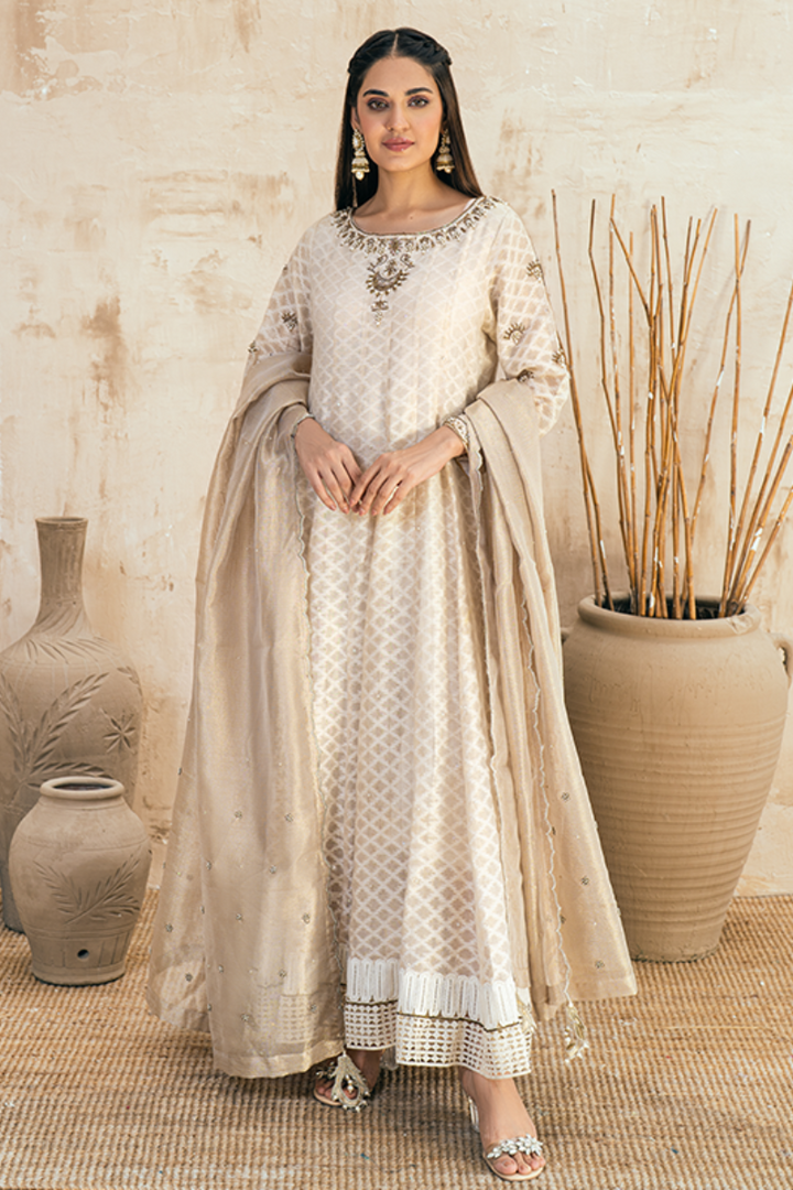 'Ilsa' is an ivory cotton net kalidaar enhanced with intricate hand embroidery comprising of pearls, sequins, kora, dabka zardozi work. Hemline is finished with lace. It is paired with matching choridar and Maysuri net dupatta with booti chan overall.