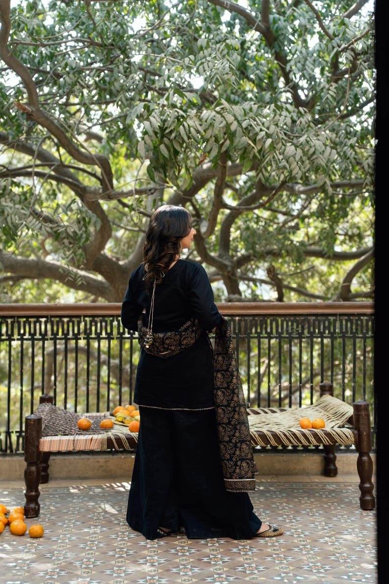 Shirt: Black khaddar embroidered short shirt with rounded square neckline, zari and gota details, dori tassels on back and embroidered sleeves.