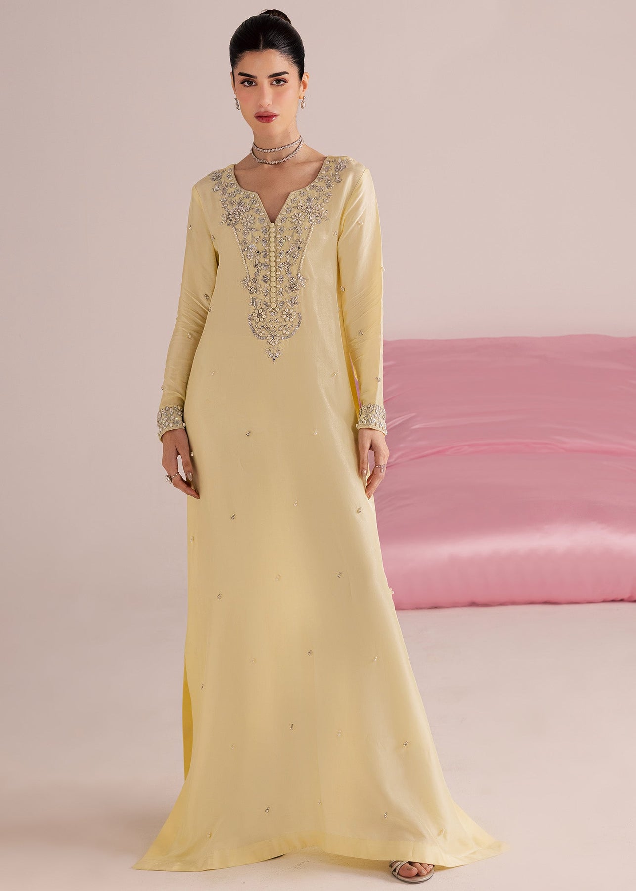 Fresh and luminous, this butter-yellow ensemble is designed to feel effortless, airy, and quietly celebratory. The soft pastel tone brings a sense of warmth and lightness, making the silhouette feel fluid and relaxed while remaining undeniably refined. The long, flowing kaftan shirt is detailed with delicate silver embroidery along the neckline, arranged in an elegant, elongated motif that draws the eye without overwhelming the design. Subtle scattered embellishments across the body add a gentle shimmer, catching the light with every movement. Finished with embroidered cuffs, the craftsmanship feels thoughtful and balanced.
