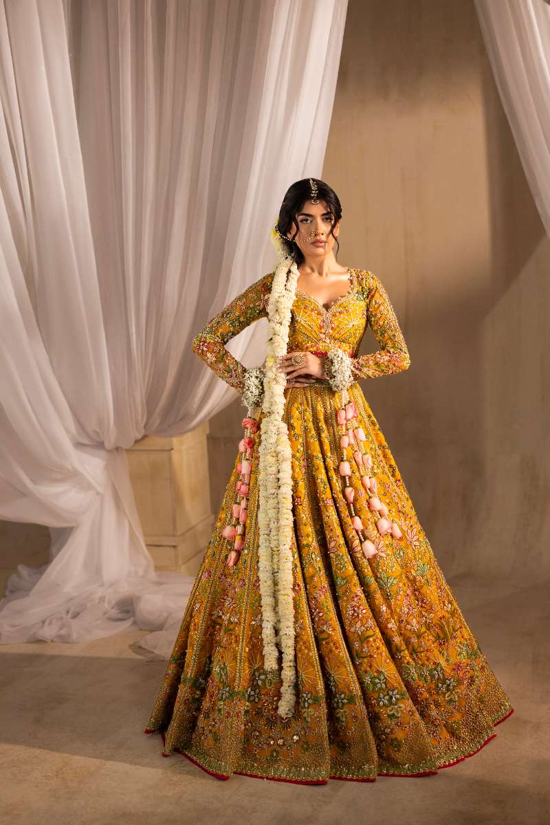 Anayra Amal - Henna Embroidered + Hand Embellishment Net Suit For Women - Mustard Yellow - 3 Piece