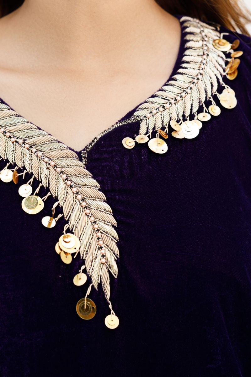 This winter season, shimmer in this ethereal purple velvet shirt with asymmetrical handwork along the neckline.