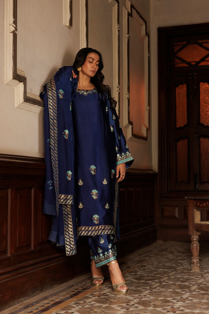 A striking 3-piece pure silk ensemble in royal blue, featuring a long A-line shirt adorned with intricate block prints in gold and firozi, blending traditional artistry with elegant flair. The coordinated royal blue izaar is delicately block printed in matching tones, adding texture and sophistication. Completing the look is a flowing blue dupatta, beautifully detailed with gold and firoze block prints.