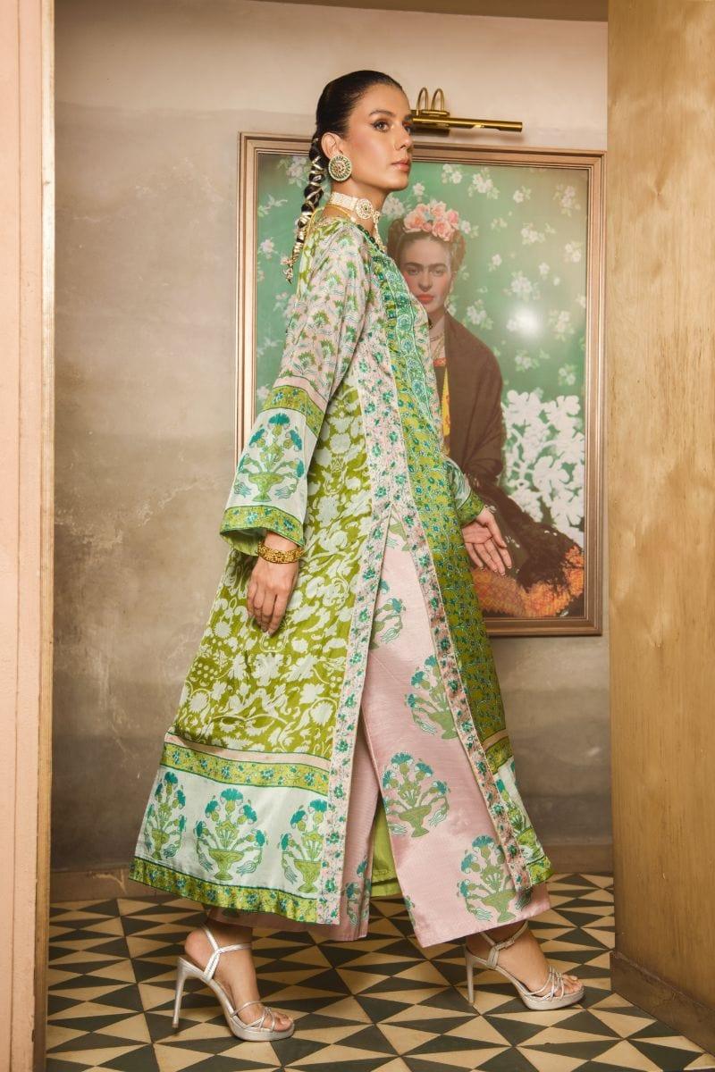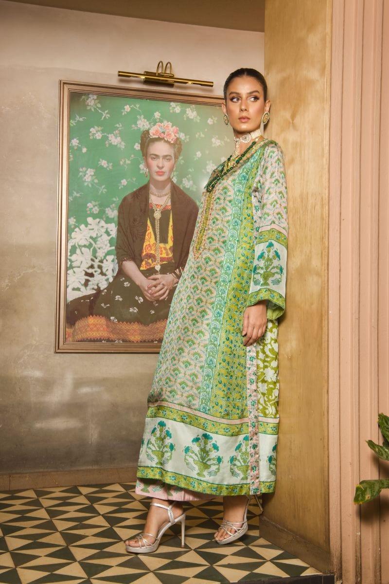Green silk kaftan with gold embellishment paired with matching azaar & chiffon block printed dupatta Shirt Length: 52 Inches Pant Length: 38 Inches