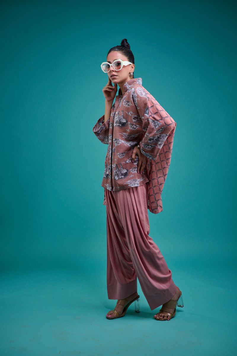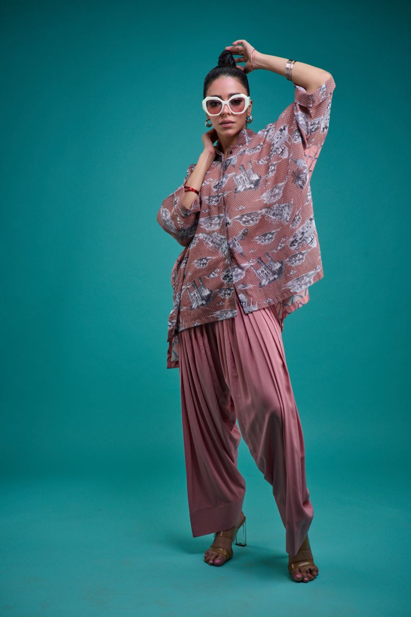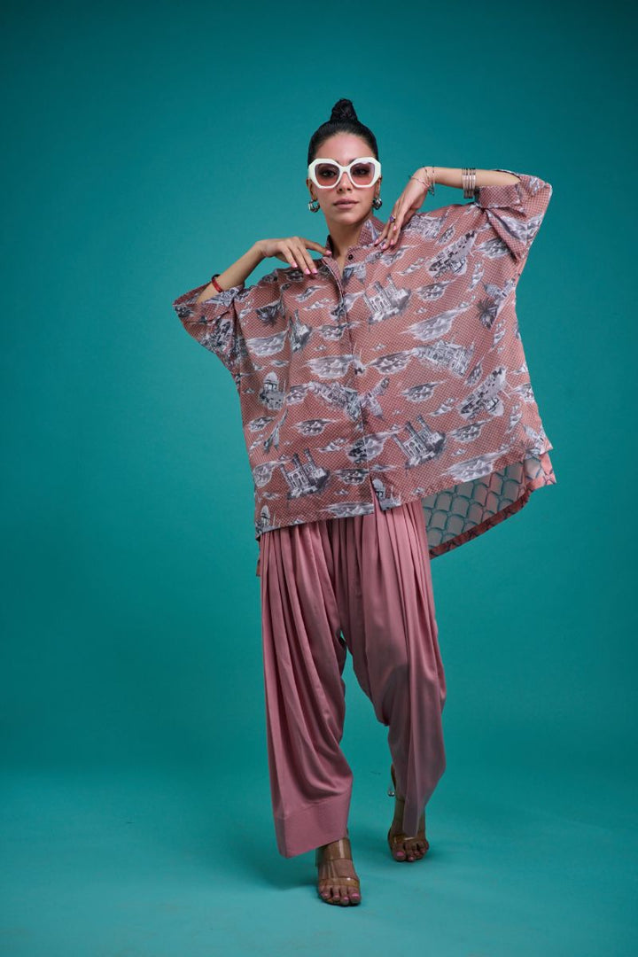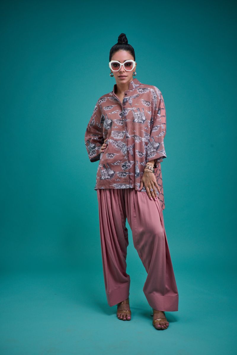 Wear your Heart in our all new Toile de Pakistan Collection! Our Toile de Pakistan Print are an ode toile heritage buildings in the landscape of the country. This co-ord set features a loose fit top with front buttons and a band collar, paired with our newest shalwar, perfectly pleated with a wide hem for an edgy look.