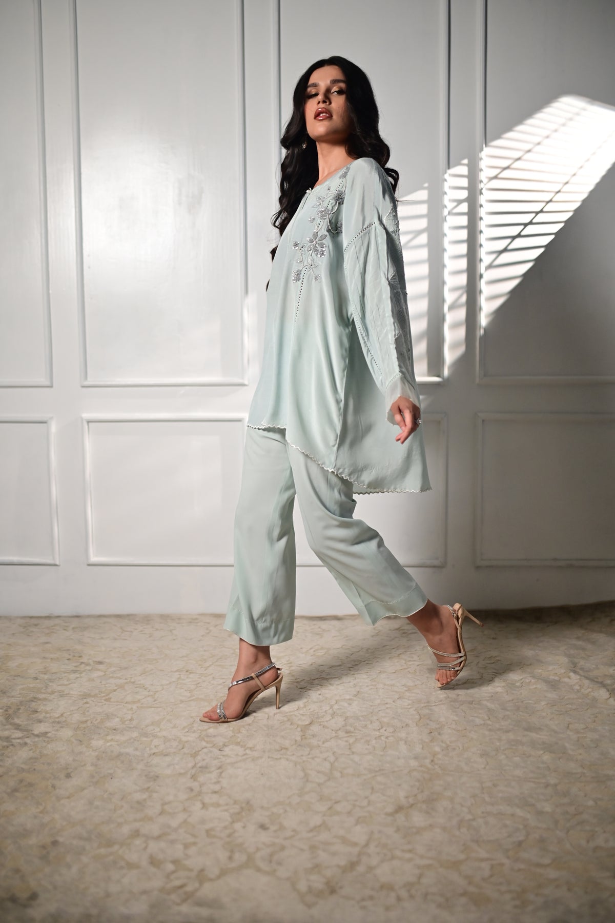 This dreamy boxy cut set bursting with delicate french knot embriodered motifs and lots of detailing. The striking back schiffli yoke adds delicate elegance and intricate charm. Sleeves stun with pleated details, lacing, and organza cuffs finished with pearls. Styled with sleek culottes for a fierce, fashion forward silhouette. An ultra-stylish statement piece that’s equal parts classic and cutting edge.