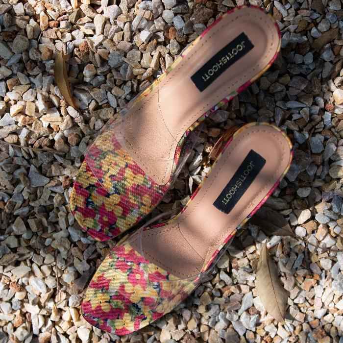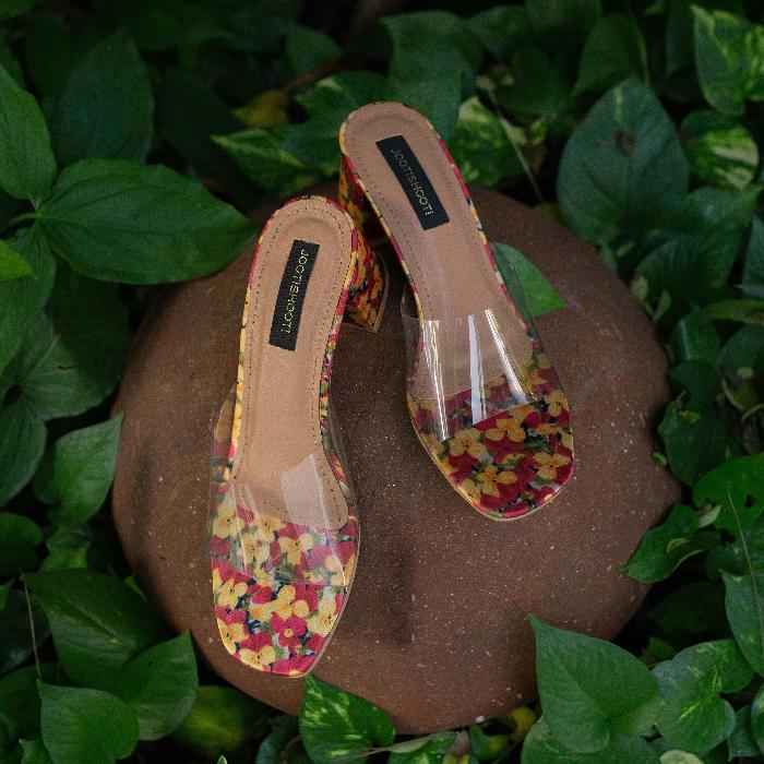 Introducing Flora-The embodiment of timeless class and floral charm! With its transparent upper and nude foot bed adorned with a delightful floral toe rand, this pair is a true statement of elegance. The subtle hues of pink, yellow, and greens on the foot bed beautifully complement each other, creating a harmonious blend of colors. But what truly sets Flora apart is its unique heel, adorned with intricate floral prints, adding an extra touch of sophistication and individuality. Step into Flora and let your feet blossom with every step!