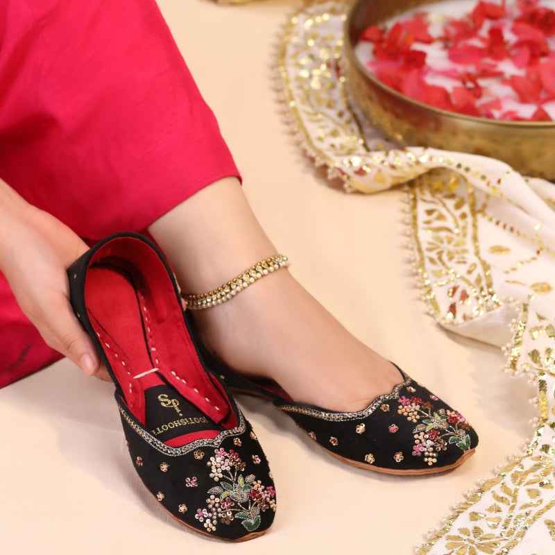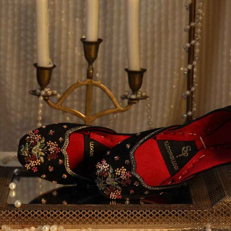 A luxe black khussa with a vivid red lining and handwork that blooms in ombre. Ombre Oasis features clustered florals in jewel tones with gold sequins and cut dana that graduate in depth for a rich, dimensional look. Master artisans finish each pair by hand. A cushioned insole and flexible sole keep you comfortable from ceremony to after party.