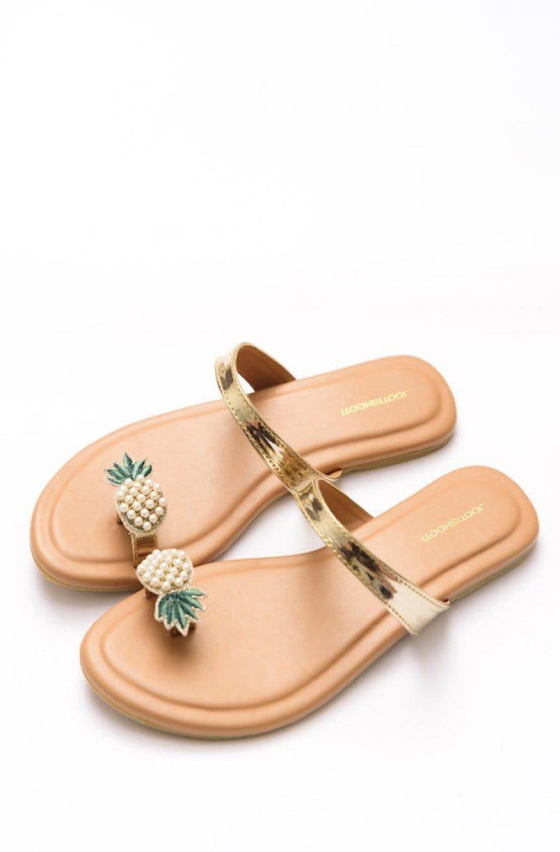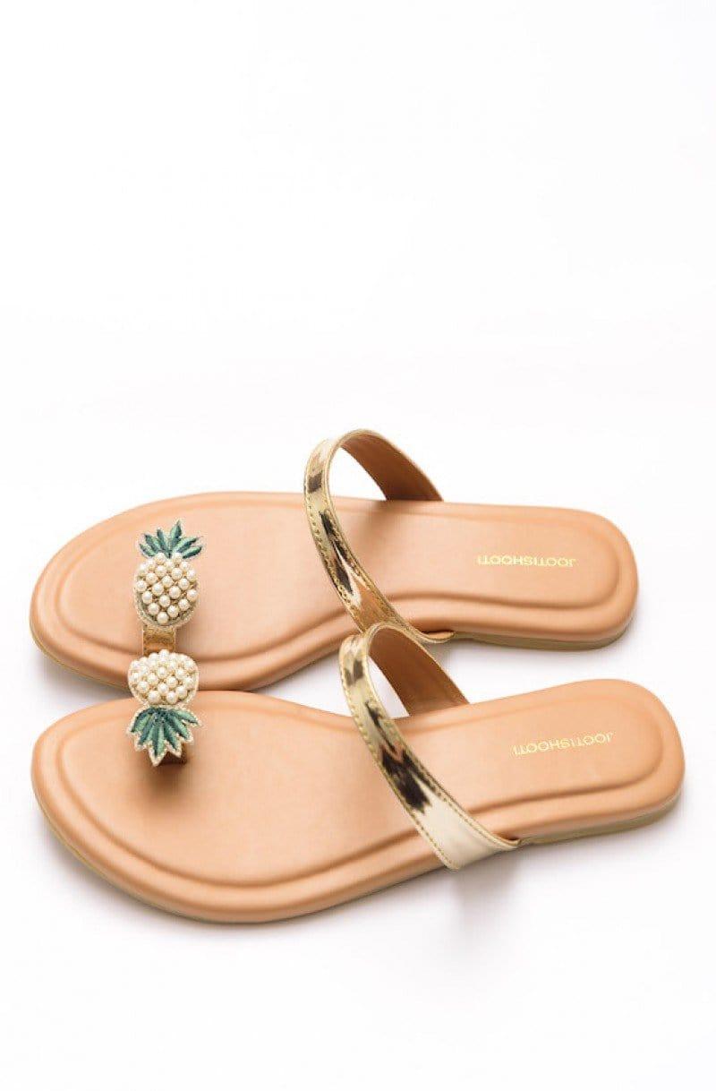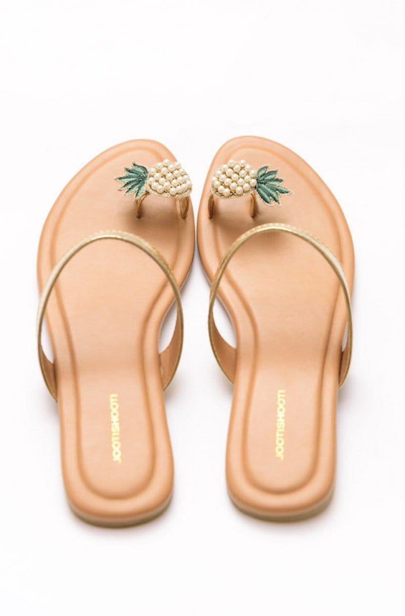 A modern twist to the kohlapuri, with a sleek gold strap and a sassy pineapple brodge.  -Upper-Gold Leatherette -Flat Heel -Anti-slip Sole -Foam Padding for insole for comfort Handcrafted in Pakistan Care: Super easy to clean! Wipe with a sliglty damp cloth to clean off any dust.   Disclaimer: Product color may vary due to lighting, screen pixel and color settings.