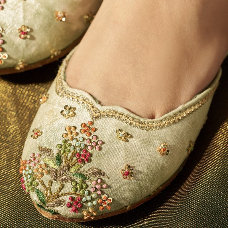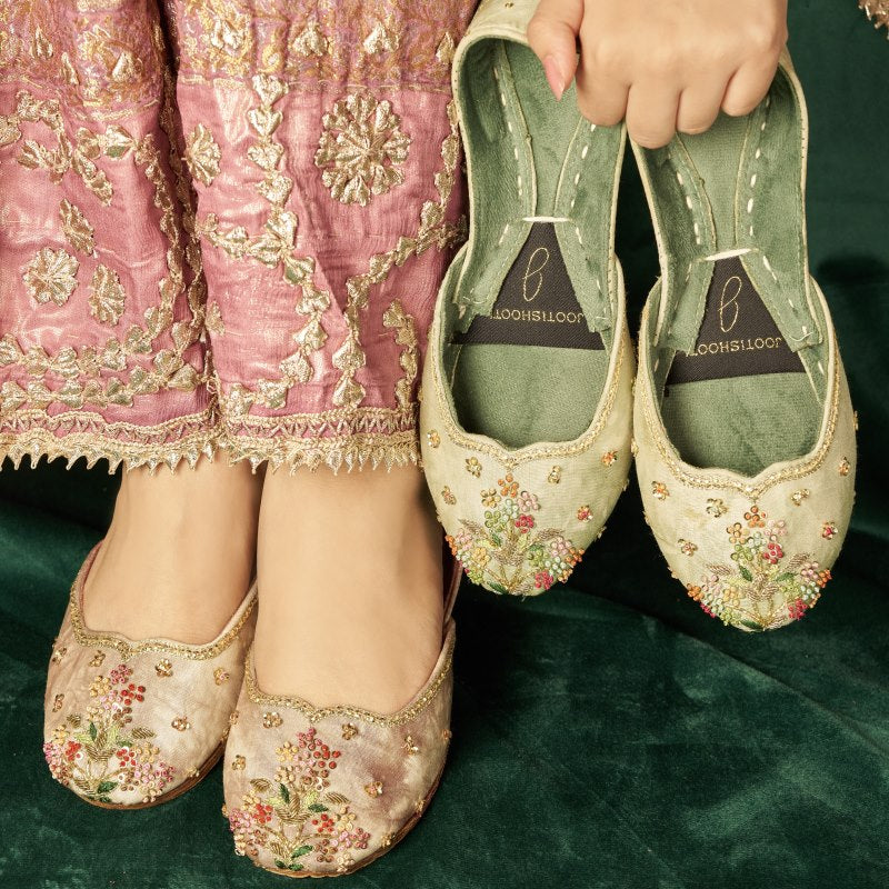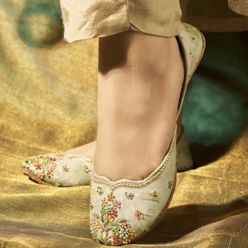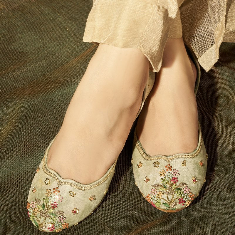 Introducing our exquisitely handcrafted floral embroidered khussas. These elegant shoes feature a delicate array of colorful blossoms and leaves, meticulously stitched onto soft, green tie & dye fabric. The intricate beadwork adds a touch of sparkle and sophistication, while the scalloped edge, embellished with fine gold thread, enhances the luxurious feel of these khussas. Perfect for special occasions or adding a touch of glamour to everyday wear, these juttis combine comfort and timeless beauty. The soft, cushioned insole ensures all-day comfort, while the durable sole provides excellent support. Elevate your footwear collection with these stunning embroidered juttis that bring artistry and elegance to your style.