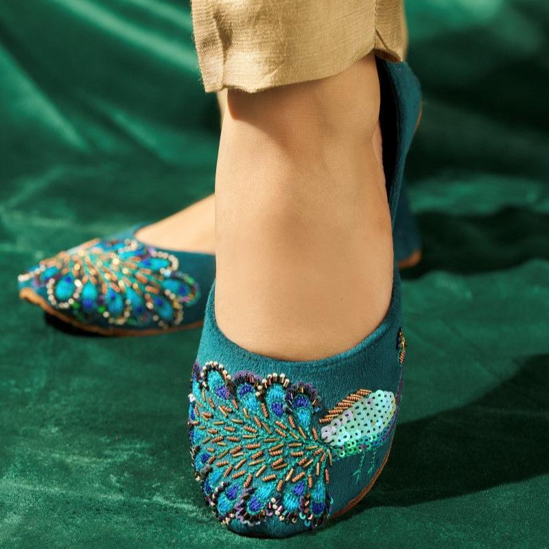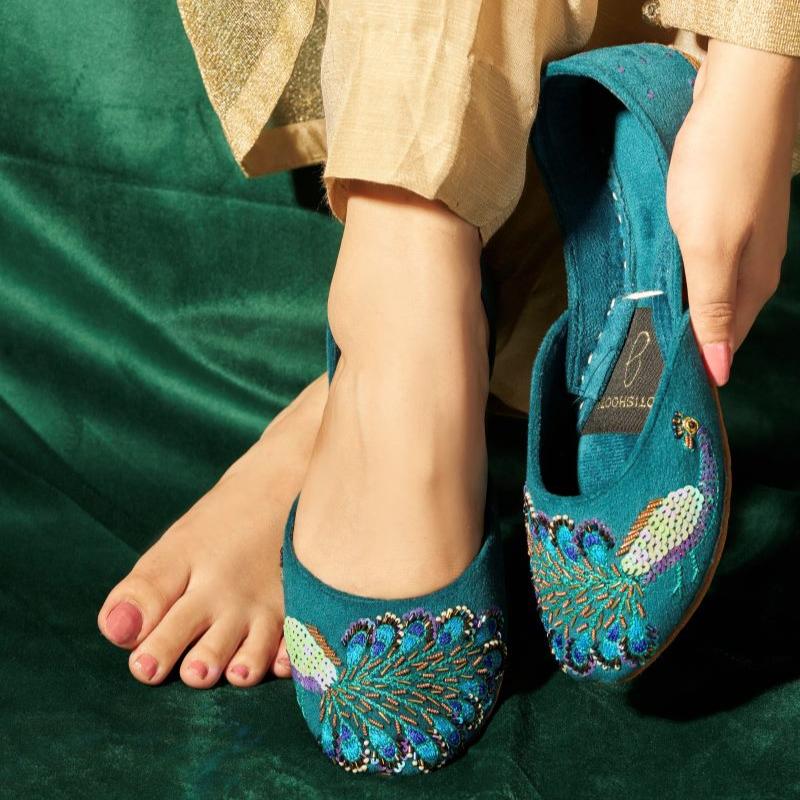 Step into elegance with our Peacock embroidery khussas. These exquisite traditional khussas feature intricate peacock embroidery, showcasing vibrant hues of blue, green, and gold. Handcrafted with precision, the detailed beadwork and sequins add a touch of sparkle, making these juttis perfect for festive occasions or adding a unique flair to your everyday attire. The soft, teal-colored fabric ensures comfort, while the leather sole provides durability. Pair these juttis with your favorite ethnic wear or modern outfits for a stunning, versatile look.