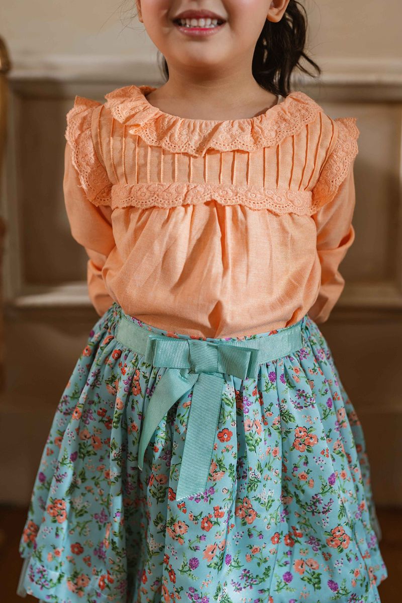 Crafted from the finest Silk, our Party Edit features stunning pieces such as the Ariel skirt. The design and craftsmanship is a prime examples of our brand's dedication to creating timeless pieces for the youngest member of the family. Featuring a vibrant ditsy floral print on an aqua-coloured base, a silky ribbon at the waist and a tulle frill underskirt hem makes this an adorable style statement especially when paired with our Peach frilly blouse.