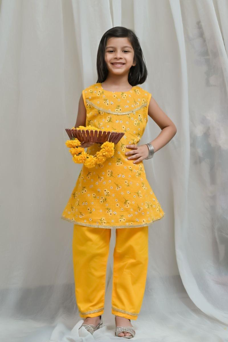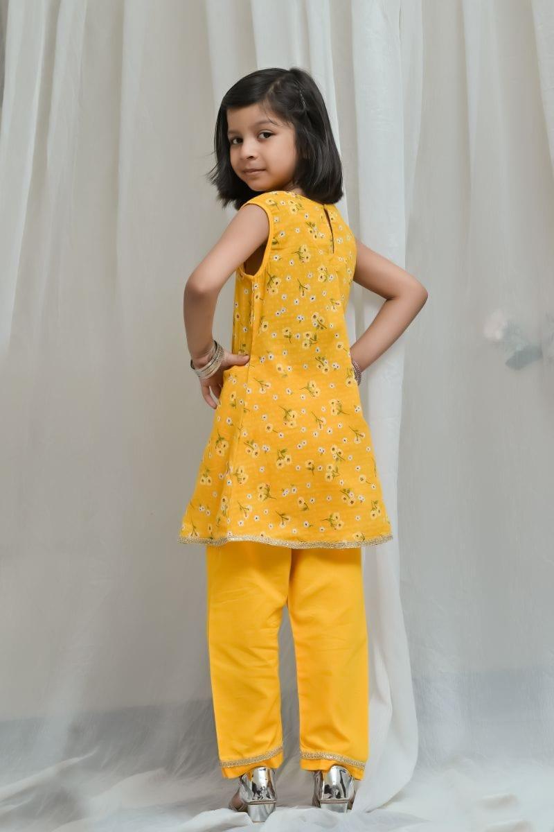 Shirt: A- Line mustard yellow printed Swiss Lawn Cotton detailed with nice gota lace work