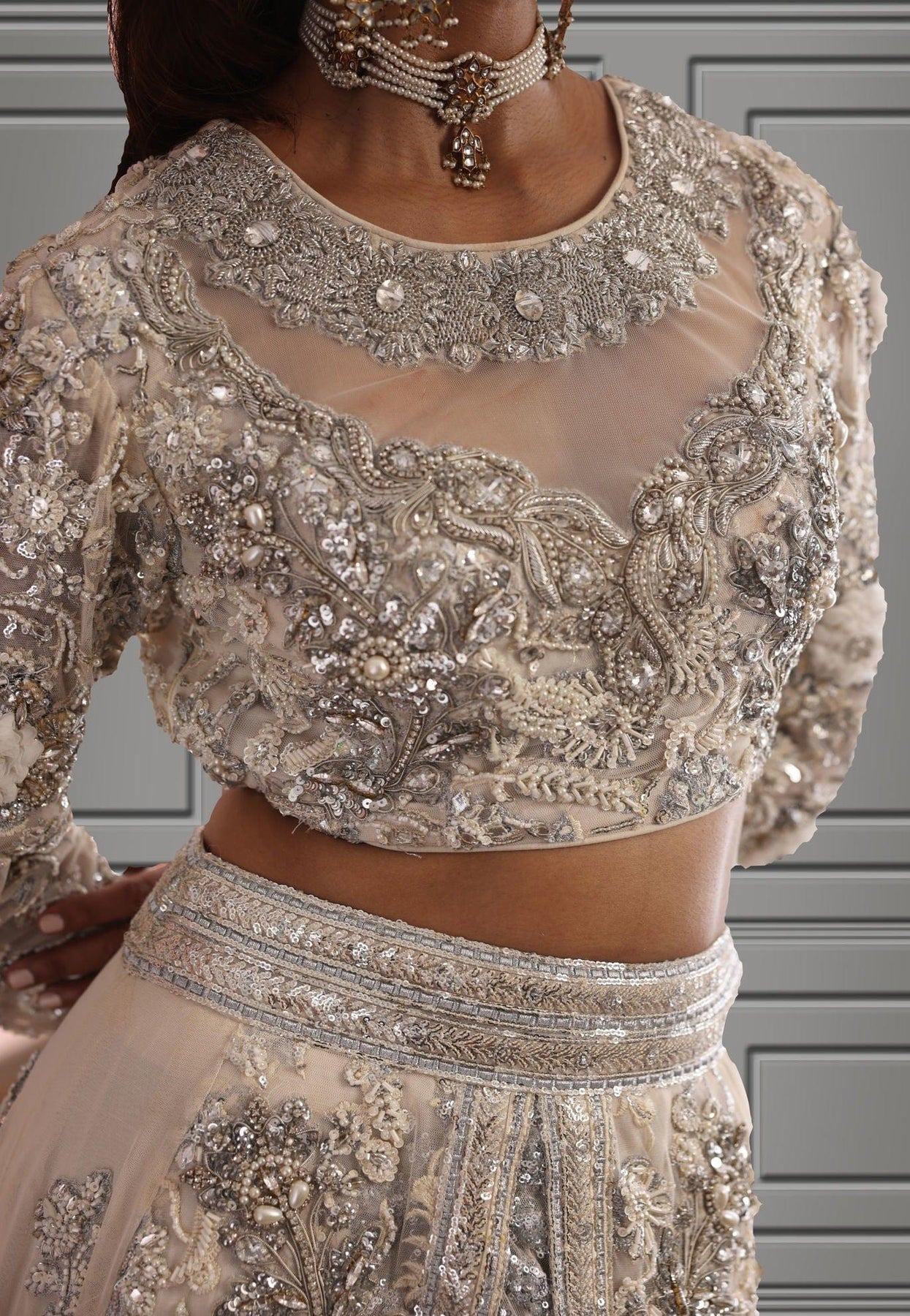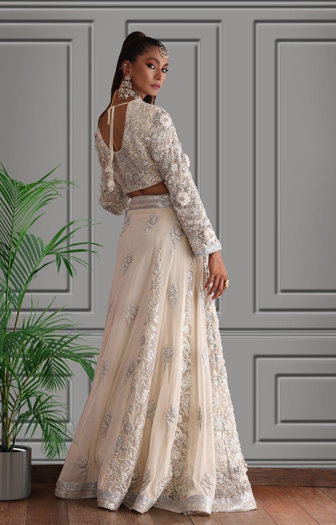 Exquisitely crafted classic off white and silver choli, lehnga and duppatta. This magical art piece is layered with 3D organza flowers, silver dabka, naqshi, sequins, resham thread and pearls. This outfit is paired with heavy duppatta fully handcrafted with zardozi work. You can order through website or call or have an appointment with Shamaeel to customize colors of your choice.
