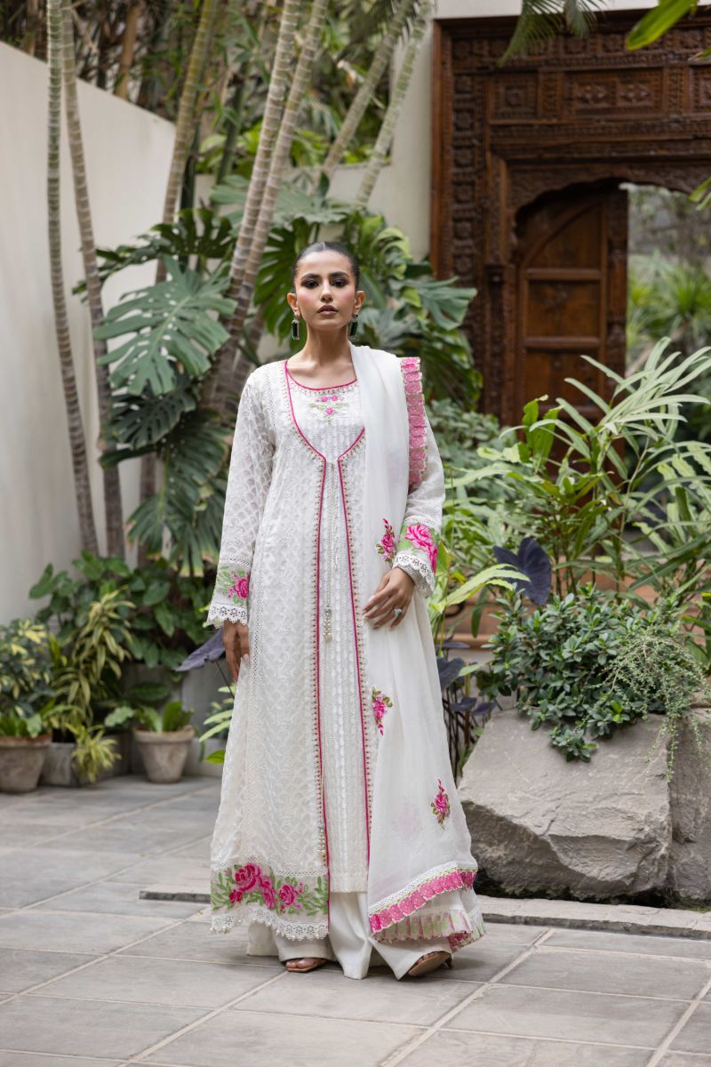 White chiffon embroidered shirt paired with pink arri work paired with pants & chiffon dupatta with frill detailing